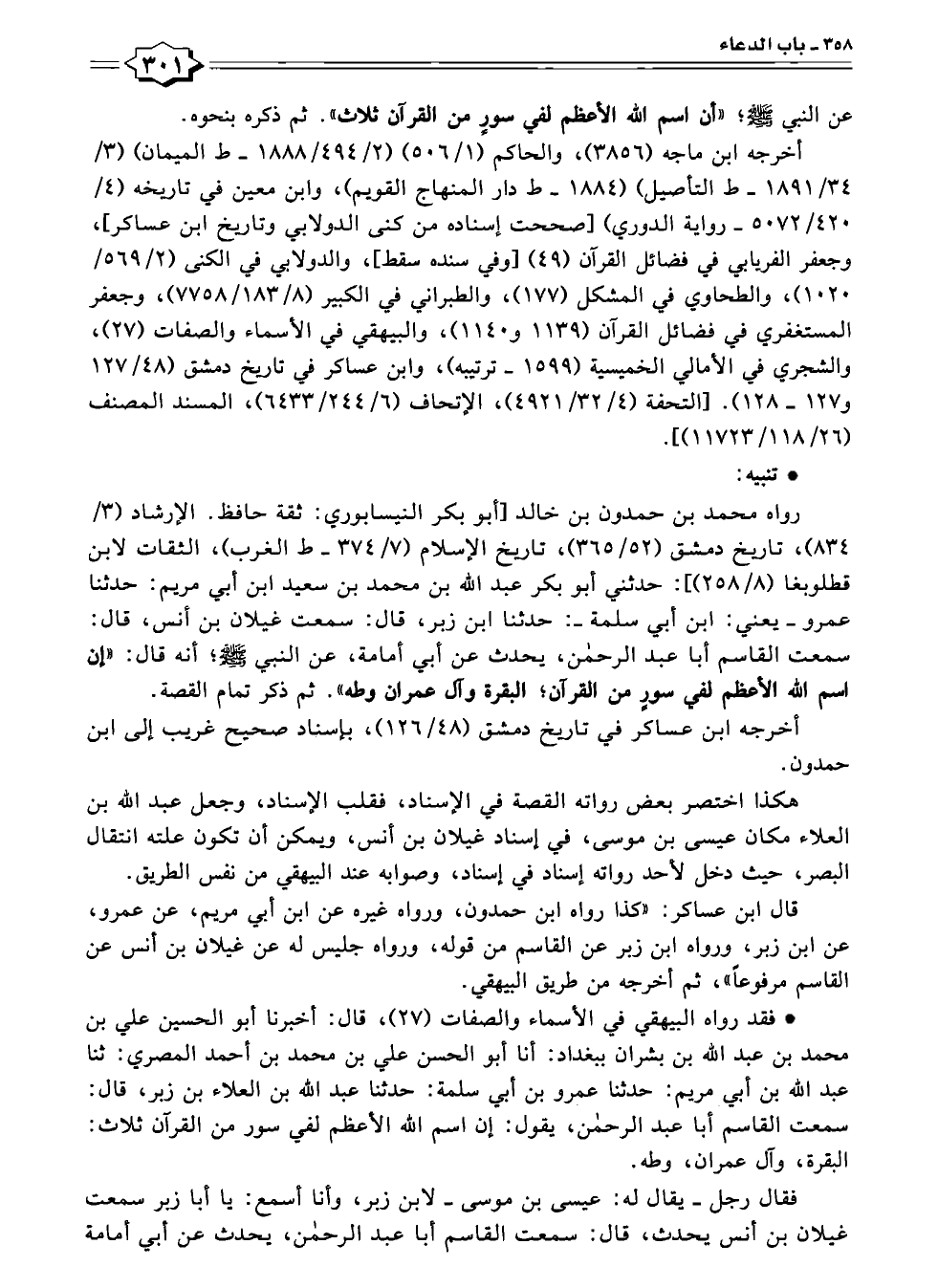 * فقد رواه البيهقي في الأسماء والصفات (٢٧)، قال: أخبرنا أبو الحسين علي بن محمد بن عبد اللّه بن بشران ببغداد: أنا أبو الحسن علي بن محمد بن أحمد المصري: ثنا عبد الله بن أبي مريم: حدثنا عمرو بن أبي سلمة: حدثنا عبد اللّه بن العلاء بن زبر، قال: سمعت القاسم أبا عبد الرحمن، يقول: إن اسم الله الأعظم لفي سور من القرآن ثلاث: البقرة، وآل عمران، وطه.