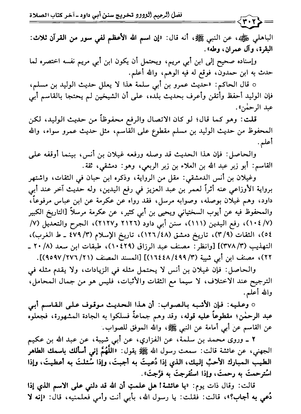 ° قال الحاكم: "حديث عمرو بن أبي سلمة هذا لا يعلل حديث الوليد بن مسلم، فإن الوليد أحفظ وأتقن وأعرف بحديث بلده، على أن الشيخين لم يحتجا بالقاسم أبي عبد الرحمن".