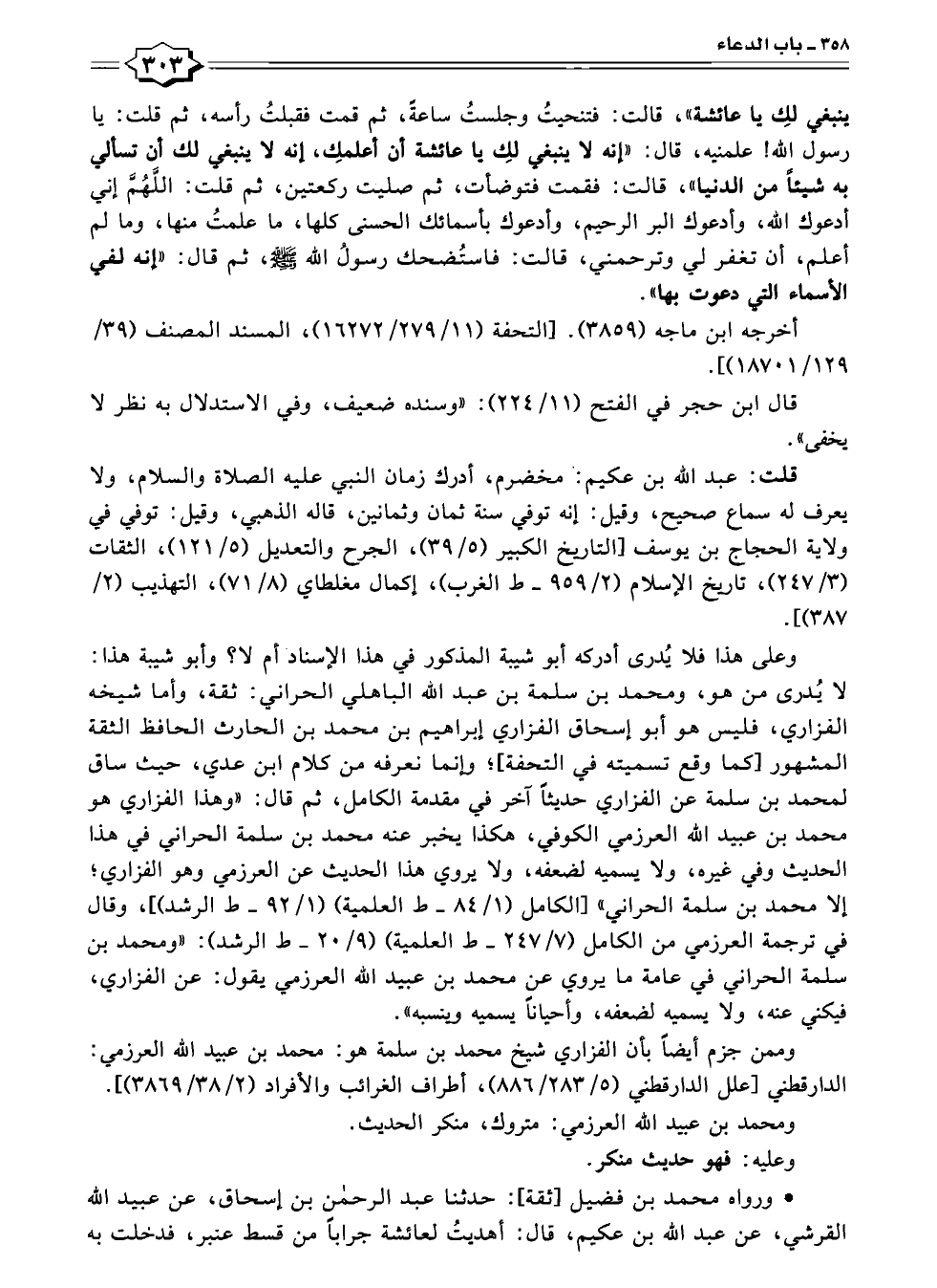 وعلى هذا فلا يُدرى أدركه أبو شيبة المذكور في هذا الإسناد أم لا؟ وأبو شيبة هذا: لا يُدرى من هو، ومحمد بن سلمة بن عبد الله الباهلي الحراني: ثقة، وأما شيخه الفزاري، فليس هو أبو إسحاق الفزاري إبراهيم بن محمد بن الحارث الحافظ الثقة المشهور [كما وقع تسميته في التحفة]؛ وإنما نعرفه من كلام ابن عدي، حيث ساق لمحمد بن سلمة عن الفزاري حديثًا آخر في مقدمة الكامل، ثم قال: "وهذا الفزاري هو محمد بن عبيد الله العرزمي الكوفي، هكذا يخبر عنه محمد بن سلمة الحراني في هذا الحديث وفي غيره، ولا يسميه لضعفه، ولا يروي هذا الحديث عن العرزمي وهو الفزاري؛ إلا محمد بن سلمة الحراني" [الكامل (١/ ٨٤ - ط العلمية) (١/ ٩٢ - ط الرشد)]، وقال في ترجمة العرزمي من الكامل (٧/ ٢٤٧ - ط العلمية) (٩/ ٢٠ - ط الرشد): "ومحمد بن سلمة الحراني في عامة ما يروي عن محمد بن عبيد الله العرزمي يقول: عن الفزاري، فيكني عنه، ولا يسميه لضعفه، وأحيانًا يسميه وينسبه".