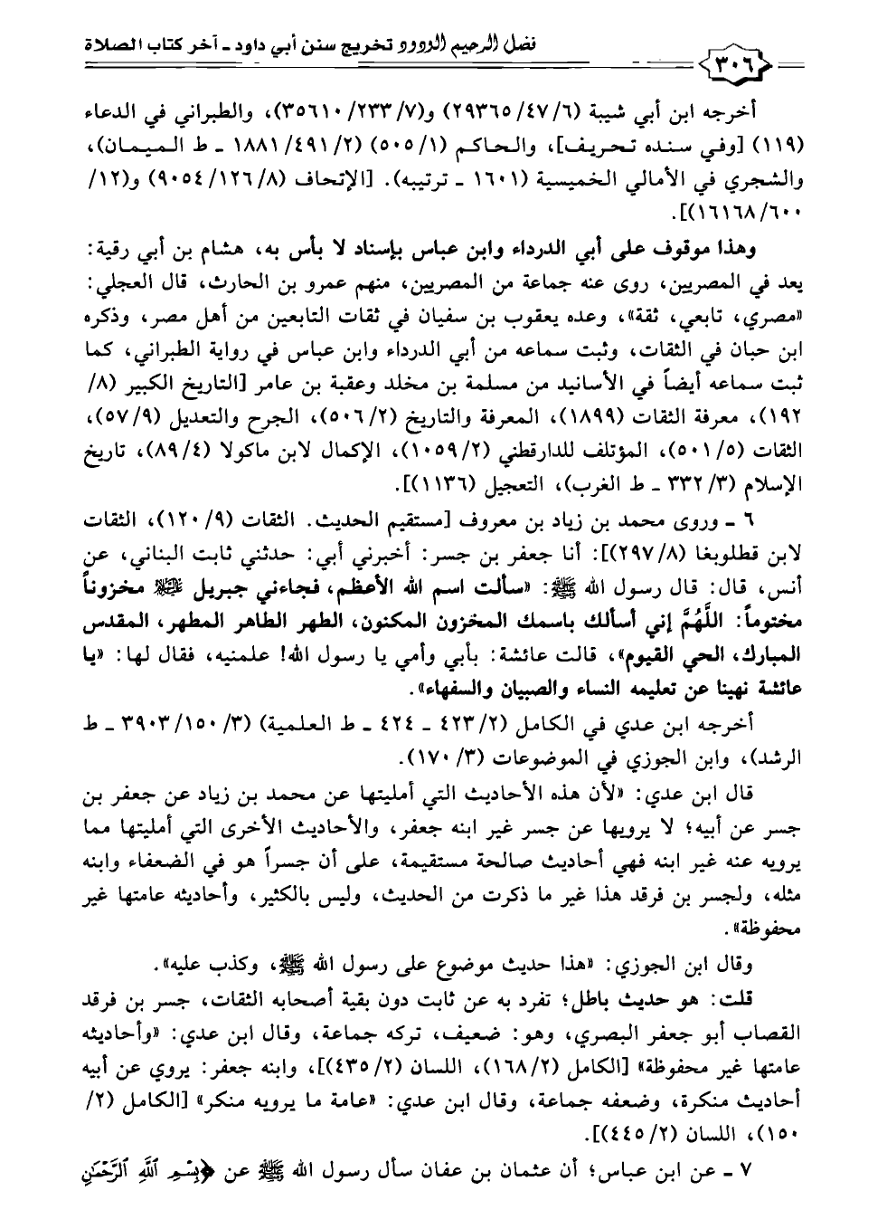 ٦ - وروى محمد بن زياد بن معروف [مستقيم الحديث. الثقات (٩/ ١٢٠)، الثقات لابن قطلوبغا (٨/ ٢٩٧)]: أنا جعفر بن جسر: أخبرني أبي: حدثني ثابت البناني، عن أنس، قال: قال رسول اللّه - صلى الله عليه وسلم -: "سألت اسم الله الأعظم، فجاءني جبريل عليه السلام مخزونًا مختومًا: اللَّهُم إني أسألك باسمك المخزون المكنون، الطهر الطاهر المطهر، المقدس المبارك، الحي القيوم"، قالت عائشة: بأبي وأمي يا رسول الله! علمنيه، فقال لها: "يا عائشة نهينا عن تعليمه النساء والصبيان والسفهاء".