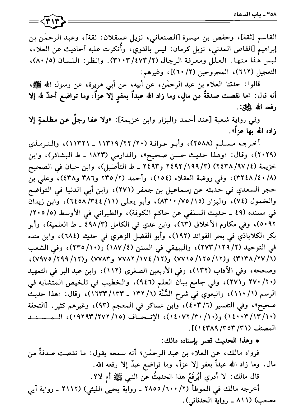 فرواه مالك، عن العلاء بن عبد الرحمن؛ أنه سمعه يقول: ما نقصت صدقة من مال، وما زاد الله عبداً بعفو إلا عزاً، وما تواضع عبدٌ إلا رفعه الله.