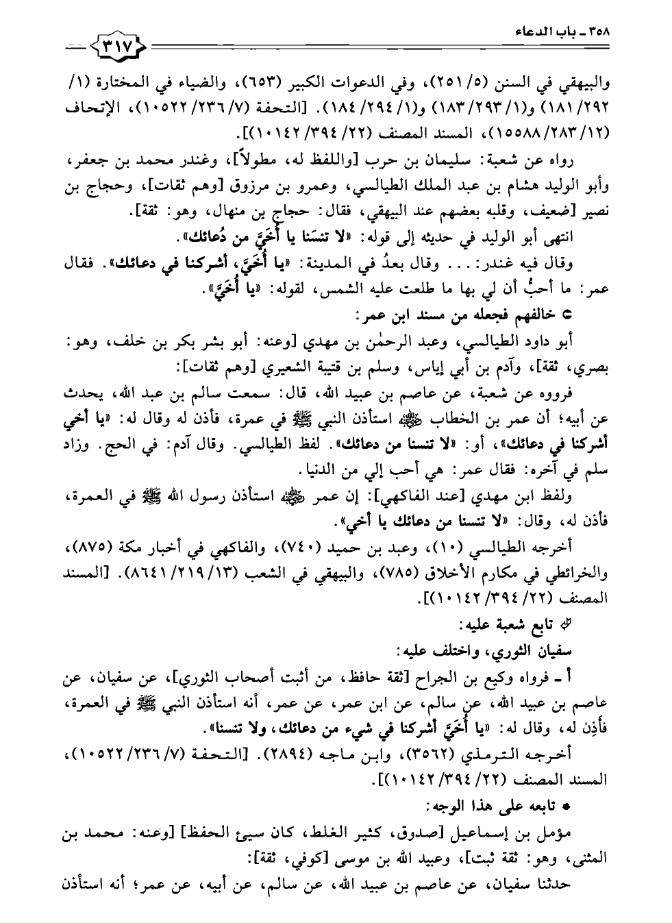 أ - فرواه وكيع بن الجراح [ثقة حافظ، من أثبت أصحاب الثوري]، عن سفيان، عن عاصم بن عبيد الله، عن سالم، عن ابن عمر، عن عمر، أنه استأذن النبي - صلى الله عليه وسلم - العمرة، فأَذِن له، وقال له: "يا أُخَيَّ أشركنا في شيء من دعائك، ولا تنسنا".