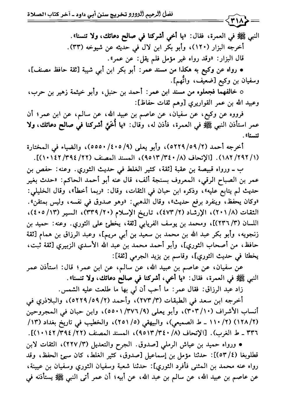 فرووه عن وكيع، عن سفيان، عن عاصم بن عبيد الله، عن سالم، عن ابن عمر؛ أن عمر استأذن النبي - صلى الله عليه وسلم - في العمرة، فأذن له، وقال: "يا أُخَيَّ أشركنا في صالح دعائك، ولا تنسنا".