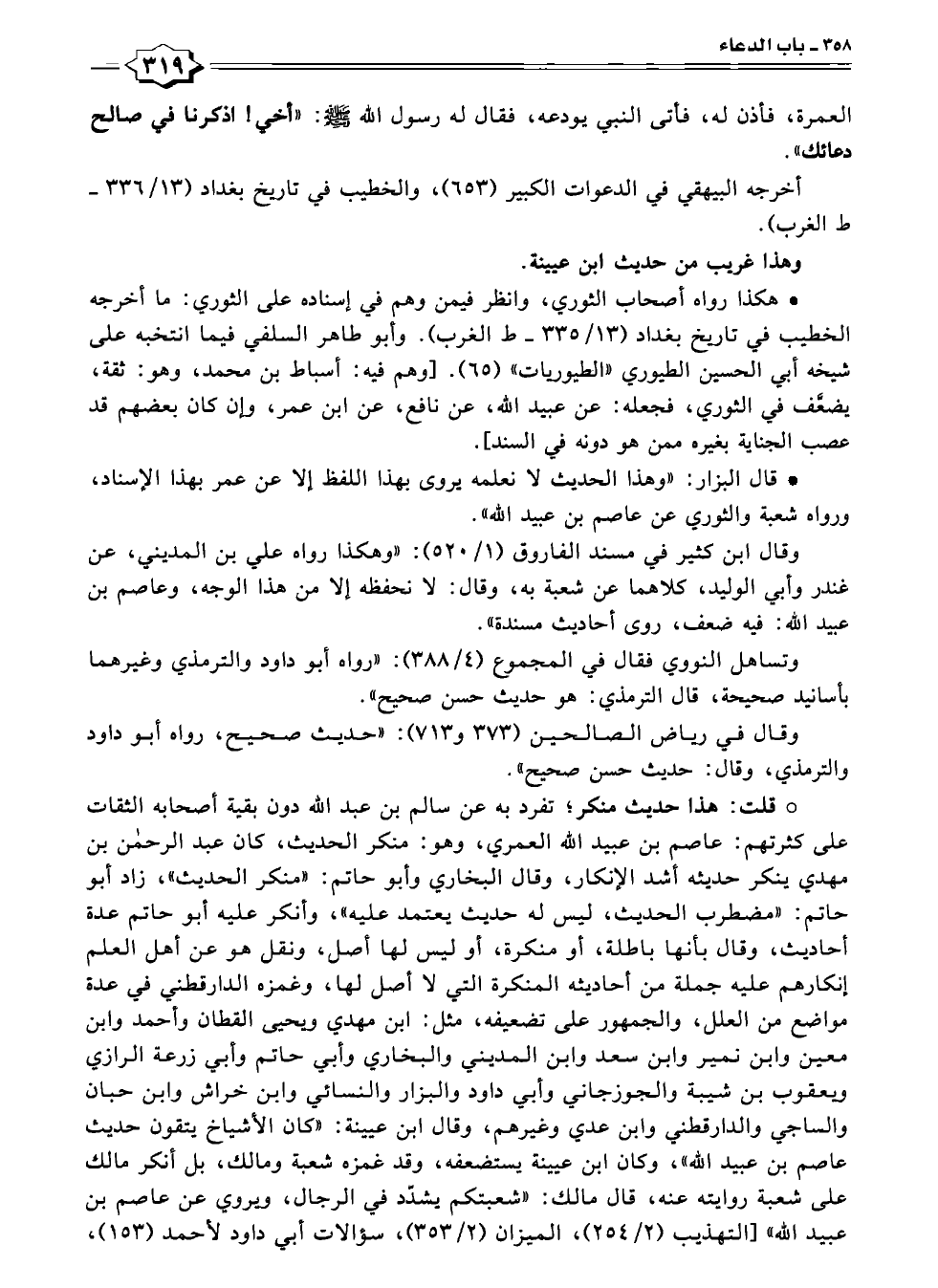 * قال البزار: "وهذا الحديث لا نعلمه يروى بهذا اللفظ إلا عن عمر بهذا الإسناد، ورواه شعبة والثوري عن عاصم بن عبيد الله".