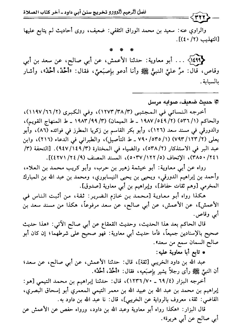 ١٤٩٩ - . . . أبو معاوية: حدثنا الأعمش، عن أبي صالح، عن سعد بن أبي وقاص، قال: مرَّ عليَّ النبيُّ - صلى الله عليه وسلم - وأنا أدعو بإِصبَعيَّ، فقال: "أحِّدْ، أحِّدْ"، وأشار بالسبابة.