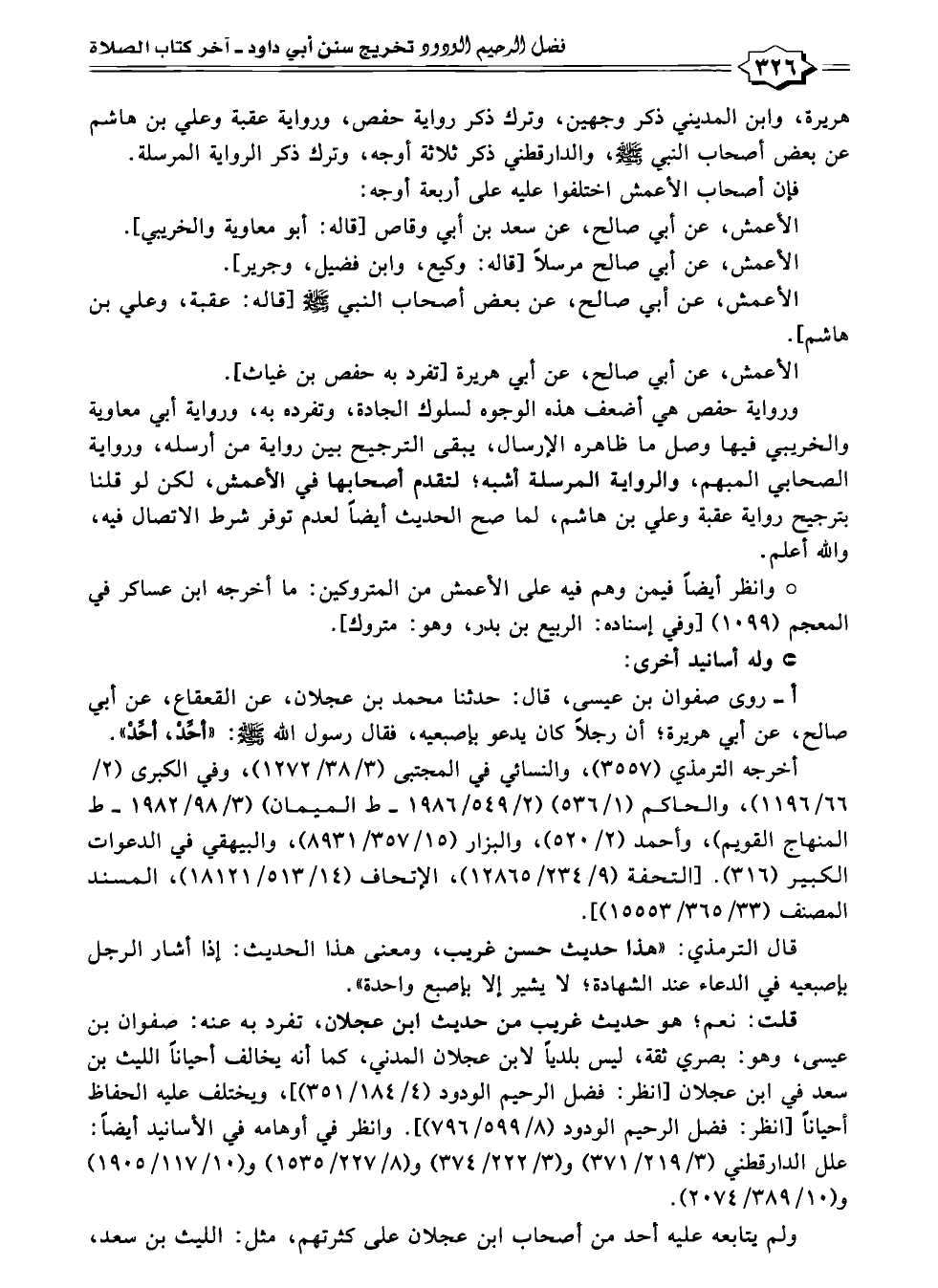 ورواية حفص هي أضعف هذه الوجوه لسلوك الجادة، وتفرده به، ورواية أبي معاوية والخريبي فيها وصل ما ظاهره الإرسال، يبقى الترجيح بين رواية من أرسله، ورواية الصحابي المبهم، والرواية المرسلة أشبه؛ لتقدم أصحابها في الأعمش، لكن لو قلنا بترجيح رواية عقبة وعلي بن هاشم، لما صح الحديث أيضاً لعدم توفر شرط الاتصال فيه، والله أعلم.