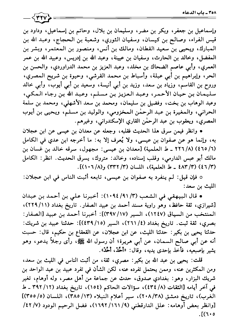 * قال البيهقي في الشعب (٣/ ٩١/ ١٠٩٤): أخبرنا علي بن أحمد بن عبدان [شيرازي، ثقة حافظ، وهو راوية مسند أحمد بن عبيد الصفار. تاريخ بغداد (١١/ ٢٢٩)، المنتخب من السياق (١٢٤٧)، السير (١٧/ ٣٩٧)]: أخبرنا أحمد بن عبيد [الصفار: بصري، ثقة ثبت. تاريخ بغداد (٤/ ٢٦١)، السير (١٥/ ٤٣٩)]: حدثنا عبيد بن شريك: حدثنا يحيى بن بكير: حدثنا الليث، عن ابن عجلان، عن القعقاع بن حكيم، قال: حسبت أنه عن أبي صالح السمان، عن أبي هريرة؛ أن رسول الله - صلى الله عليه وسلم -، رأى رجلاً يدعو، وهو يشير بإصبعيه، فأخذ بإحدى يديه، وقال: "أحِّدْ، أحِّدْ".