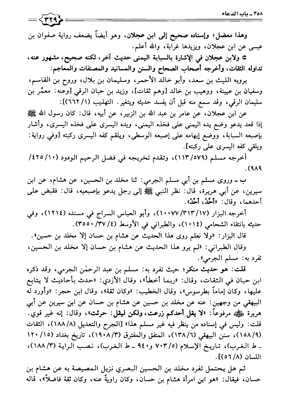 ولابن عجلان في الإشارة بالسبابة اليمنى حديث آخر، لكنه صحيح، مشهور عنه، تداوله الثقات، وأخرجه أصحاب الصحاح والسنن والمسانيد والمصنفات والمعاجم:
