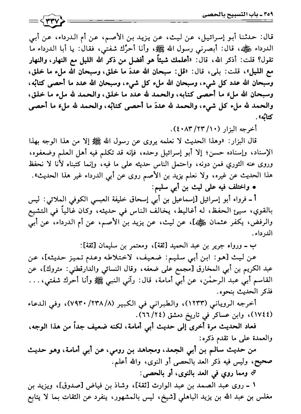قال: حدثنا أبو إسرائيل، عن ليث، عن يزيد بن الأصم، عن أم الدرداء، عن أبي الدرداء - رضي الله عنه -، قال: أبصرني رسول الله - صلى الله عليه وسلم -، وأنا أحرِّك شفتي، فقال: يا أبا الدرداء ما تقول؟ قلت: أذكر الله، قال: "أعلمك شيئاً هو أفضل من ذكر الله الليل مع النهار، والنهار مع الليل"، قلت: بلى، قال: "قل: سبحان الله عددَ ما خلق، وسبحان الله ملء ما خلق، وسبحان الله عدد كل شيء، وسبحان الله ملء كل شيء، وسبحان الله عدد ما أحصى كتابُه، وسبحان الله ملءَ ما أحصى كتابه، والحمد لله عدد ما خلق، والحمد لله ملء ما خلق، والحمد لله ملء كل شيء، والحمد لله عددَ ما أحصى كتابُه، والحمد لله ملءَ ما أحصى كتابُه".
