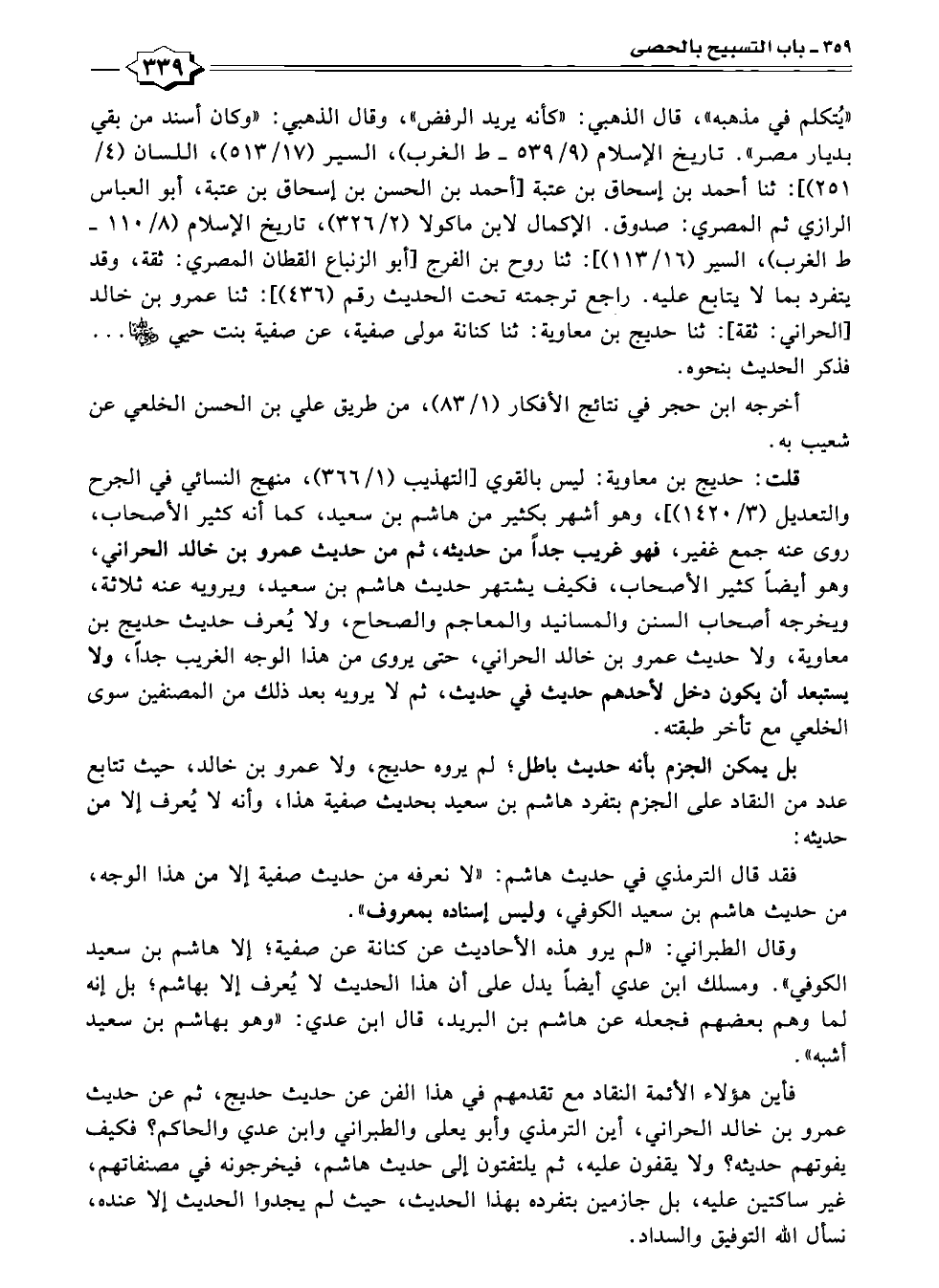 فأين هؤلاء الأئمة النقاد مع تقدمهم في هذا الفن عن حديث حديج، ثم عن حديث عمرو بن خالد الحراني، أين الترمذي وأبو يعلى والطبراني وابن عدي والحاكم؟ فكيف يفوتهم حديثه؟ ولا يقفون عليه، ثم يلتفتون إلى حديث هاشم، فيخرجونه في مصنفاتهم، غير ساكتين عليه، بل جازمين بتفرده بهذا الحديث، حيث لم يجدوا الحديث إلا عنده، نسال الله التوفيق والسداد.