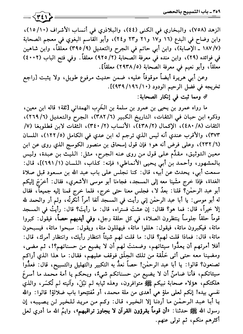 ما رواه عمرو بن يحيى بن عمرو بن سلمة بن الخَرِب الهمداني [ثقة؛ قاله ابن معين، وذكره ابن حبان في الثقات، التاريخ الكبير (٦/ ٣٨٢)، الجرح والتعديل (٦/ ٢٦٩)، الثقات (٨/ ٤٨٠)، الإكمال (٢/ ٤٣٨)، الأنساب (٢/ ٣٤٠)، الثقات لابن قطلوبغا (٧/ ٣٧٣)، والأقرب عندي أنه ليس الذي ترجم له ابن عدي في الكامل (٥/ ١٢٢)، اللسان (٦/ ٢٣٢)، وعلى فرض أنه هو؛ فإن قول إسحاق بن منصور الكوسج الذي روى عن ابن معين التوثيق، مقدَّم على قول من روى عنه الجرح، مثل: الليث بن عبدة، وليس بالمشهور، وأحمد بن أبي يحيى الأنماطي؛ فإنه: كذاب، اللسان (١/ ٦٩١)]، قال: سمعت أبي، يحدث عن أبيه، قال: كنا نجلس على باب عبد الله بن مسعود قبل صلاة الغداة، فهذا خرج مشَينا معه إلى المسجد، فجاءنا أبو موسى الأشعري، فقال: أخرَجَ إليكم أبو عبد الرحمن؟ قلنا: بعدُ لا، فجلس معنا حتى خرج، فلما خرج قمنا إليه جميعاً، فقال له أبو موسى: يا أبا عبد الرحمن إني رأيت في المسجد آنفا أمراً أنكرتُه، ولم أر والحمد لله إلا خيراً، قال: فما هو؟ فقال: إن عشتَ فستراه، قال: ما رأيتَ؟ قال: رأيتُ في المسجد قوماً حلقاً جلوساً ينتظرون الصلاة، في كل حلقة رجل، وفي أيديهم حصاً، فيقول: كبروا مائة، فيكبرون مائة، فيقول: هللوا مائة، فيهللون مئة، ويقول: سبحوا مائة، فيسبحون مائة، قال: فماذا قلت لهم؟ قال: ما قلت لهم شيئاً انتظار رأيك، وانتظار أمرك، قال: أفلا أمرتهم أن يعدُّوا سيئاتهم، وضمنتَ لهم أن لا يضيع من حسناتهم؟!، ثم مضى، ومضينا معه حتى أتى حَلْقة من تلك الحِلَق فوقف عليهم، فقال: ما هذا الذي أراكم تصنعون؟ قالوا: يا أبا عبد الرحمن! حصاً نعدُّ به التكبير والتهليل والتسبيح، قال: فعدُّوا سيئاتكم، فأنا ضامنٌ أن لا يضيع من حسناتكم شيءٌ، ويحكم يا أمة محمد ما أسرعَ هلكتكم، هؤلاء صحابة نبيكم - صلى الله عليه وسلم - متوافرون، وهذه ثيابه لم تبْلَ، وآنيته لم تُكسَر، والذي نفسي بيده! إنكم لعلى ملةٍ هي أهدى من ملة محمد، أو مُفتتِحوا باب ضلالةٍ! قالوا: والله يا أبا عبد الرحمن ما أردنا إلا الخير، قال: وكم من مريد للخير لن يصيبه، إن رسول الله - صلى الله عليه وسلم - حدثنا: "أن قوماً يقرؤون القرآن لا يجاوز تراقيهم"، وايمُ الله ما أدري لعل أكثرهم منكم، ثم تولى عنهم.