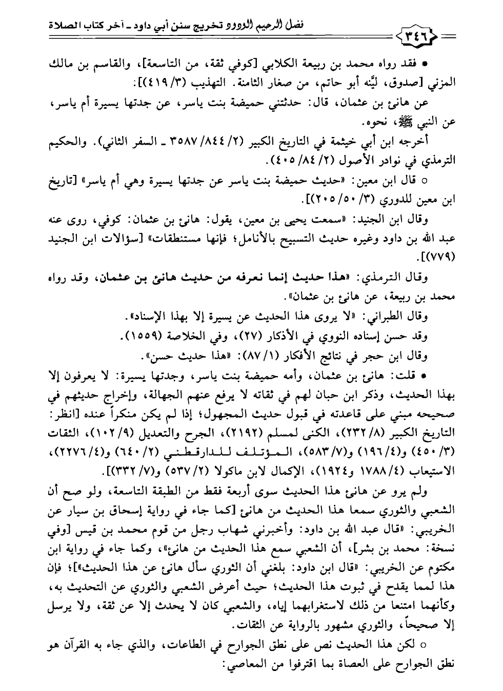 * قلت: هانئ بن عثمان، وأمه حميضة بنت ياسر، وجدتها يسيرة: لا يعرفون إلا بهذا الحديث، وذكر ابن حبان لهم في ثقاته لا يرفع عنهم الجهالة، وإخراج حديثهم في صحيحه مبني على قاعدته في قبول حديث المجهول؛ إذا لم يكن منكراً عنده [انظر: التاريخ الكبير (٨/ ٢٣٢)، الكنى لمسلم (٢١٩٢)، الجرح والتعديل (٩/ ١٠٢)، الثقات (٣/ ٤٥٠) و (٤/ ١٩٦) و (٧/ ٥٨٣)، المؤتلف للدارقطني (٢/ ٦٤٠) و (٤/ ٢٢٧٦)، الاستيعاب (٤/ ١٧٨٨ و ١٩٢٤)، الإكمال لابن ماكولا (٢/ ٥٣٧) و (٧/ ٣٣٢)].