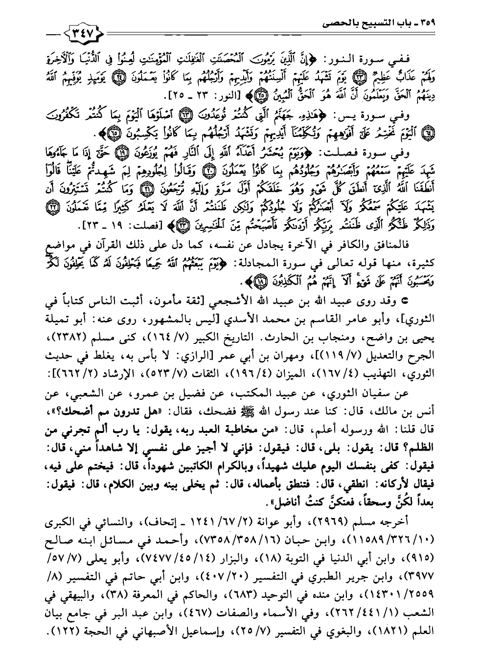 وفي سورة يس: {هَذِهِ جَهَنَّمُ الَّتِي كُنْتُمْ تُوعَدُونَ (٦٣) اصْلَوْهَا الْيَوْمَ بِمَا كُنْتُمْ تَكْفُرُونَ (٦٤) الْيَوْمَ نَخْتِمُ عَلَى أَفْوَاهِهِمْ وَتُكَلِّمُنَا أَيْدِيهِمْ وَتَشْهَدُ أَرْجُلُهُمْ بِمَا كَانُوا يَكْسِبُونَ (٦٥)}. وفي سورة فصلت: {وَيَوْمَ يُحْشَرُ أَعْدَاءُ اللَّهِ إِلَى النَّارِ فَهُمْ يُوزَعُونَ (١٩) حَتَّى إِذَا مَا جَاءُوهَا شَهِدَ عَلَيْهِمْ سَمْعُهُمْ وَأَبْصَارُهُمْ وَجُلُودُهُمْ بِمَا كَانُوا يَعْمَلُونَ (٢٠) وَقَالُوا لِجُلُودِهِمْ لِمَ شَهِدْتُمْ عَلَيْنَا قَالُوا أَنْطَقَنَا اللَّهُ الَّذِي أَنْطَقَ كُلَّ شَيْءٍ وَهُوَ خَلَقَكُمْ أَوَّلَ مَرَّةٍ وَإِلَيْهِ تُرْجَعُونَ (٢١) وَمَا كُنْتُمْ تَسْتَتِرُونَ أَنْ يَشْهَدَ عَلَيْكُمْ سَمْعُكُمْ وَلَا أَبْصَارُكُمْ وَلَا جُلُودُكُمْ وَلَكِنْ ظَنَنْتُمْ أَنَّ اللَّهَ لَا يَعْلَمُ كَثِيرًا مِمَّا تَعْمَلُونَ (٢٢) وَذَلِكُمْ ظَنُّكُمُ الَّذِي ظَنَنْتُمْ بِرَبِّكُمْ أَرْدَاكُمْ فَأَصْبَحْتُمْ مِنَ الْخَاسِرِينَ (٢٣)} [فصلت: ١٩ - ٢٣].