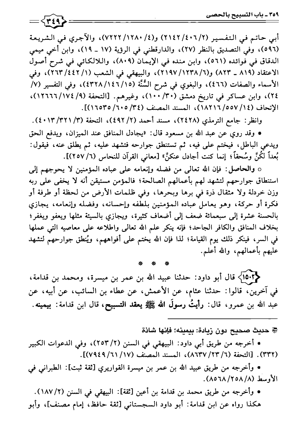 ١٥٠٢ - قال أبو داود: حدثنا عبيد الله بن عمر بن ميسرة، ومحمد بن قدامة، في آخرين، قالوا: حدثنا عثام، عن الأعمش، عن عطاء بن السائب، عن أبيه، عن عبد الله بن عمرو، قال: رأيتُ رسولَ الله - صلى الله عليه وسلم - يعقد التسبيح، قال ابن قدامة: بيمينه.