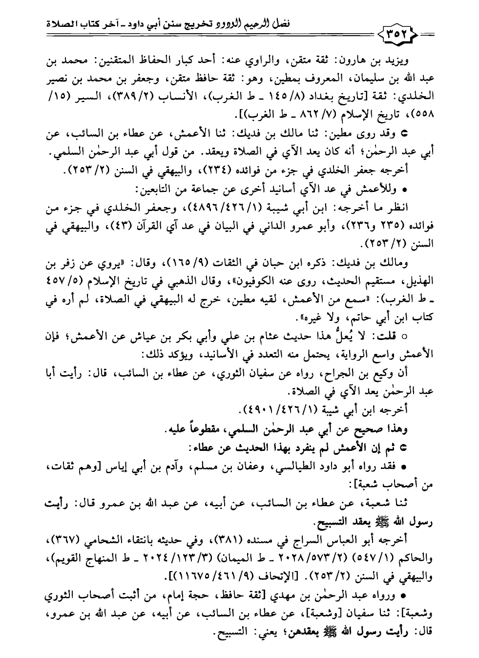 * ورواه عبد الرحمن بن مهدي [ثقة حافظ، حجة إمام، من أثبت أصحاب الثوري وشعبة]: ثنا سفيان [وشعبة]، عن عطاء بن السائب، عن أبيه، عن عبد الله بن عمرو، قال: رأيت رسول الله - صلى الله عليه وسلم - يعقدهن؛ يعني: التسبيح.