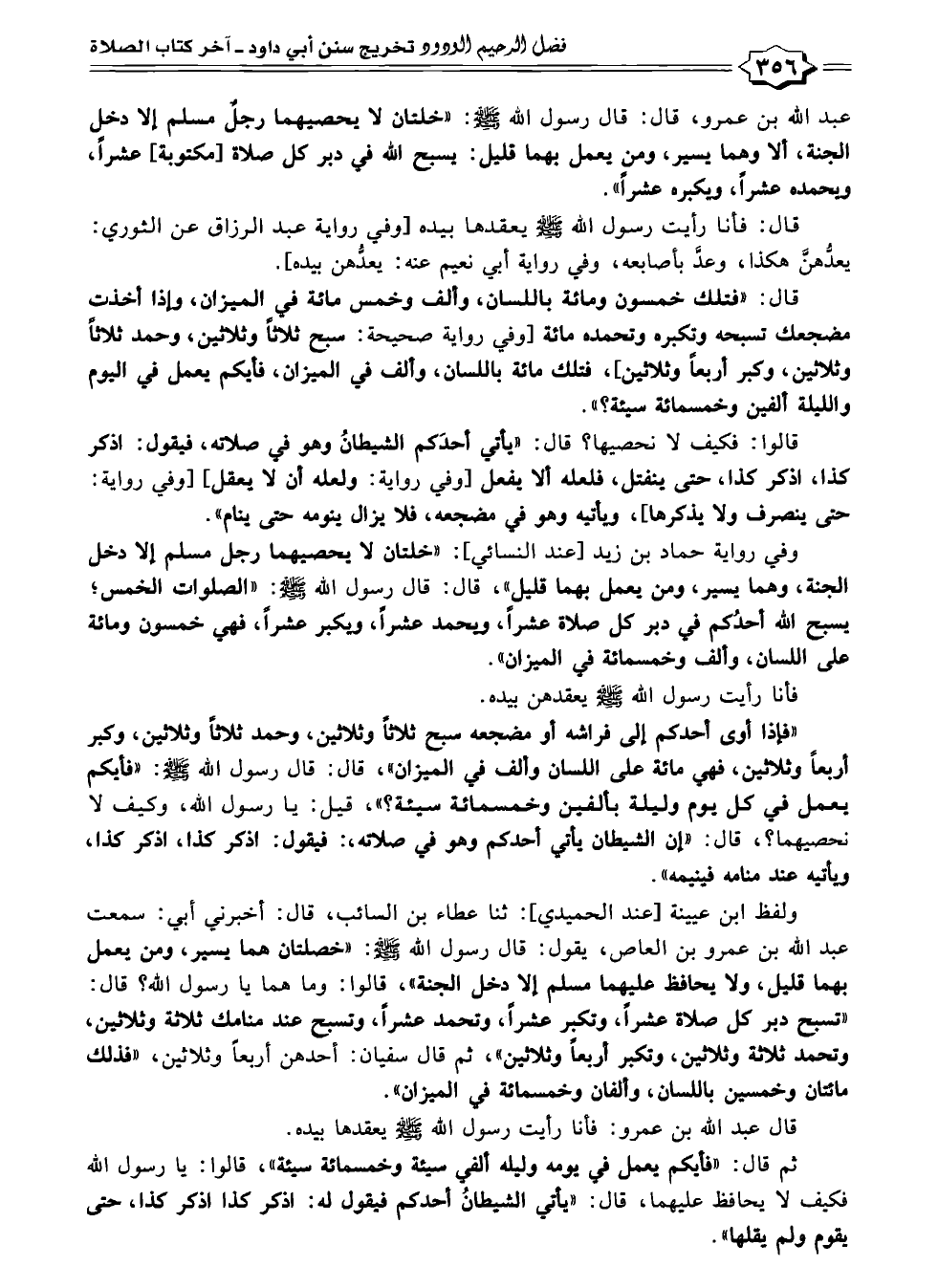 عبد الله بن عمرو، قال: قال رسول الله - صلى الله عليه وسلم -: "خلتان لا يحصيهما رجلٌ مسلم إلا دخل الجنة، ألا وهما يسير، ومن يعمل بهما قليل: يسبح الله في دبر كل صلاة [مكتوبة] عشراً، ويحمده عشراً، ويكبره عشراً".