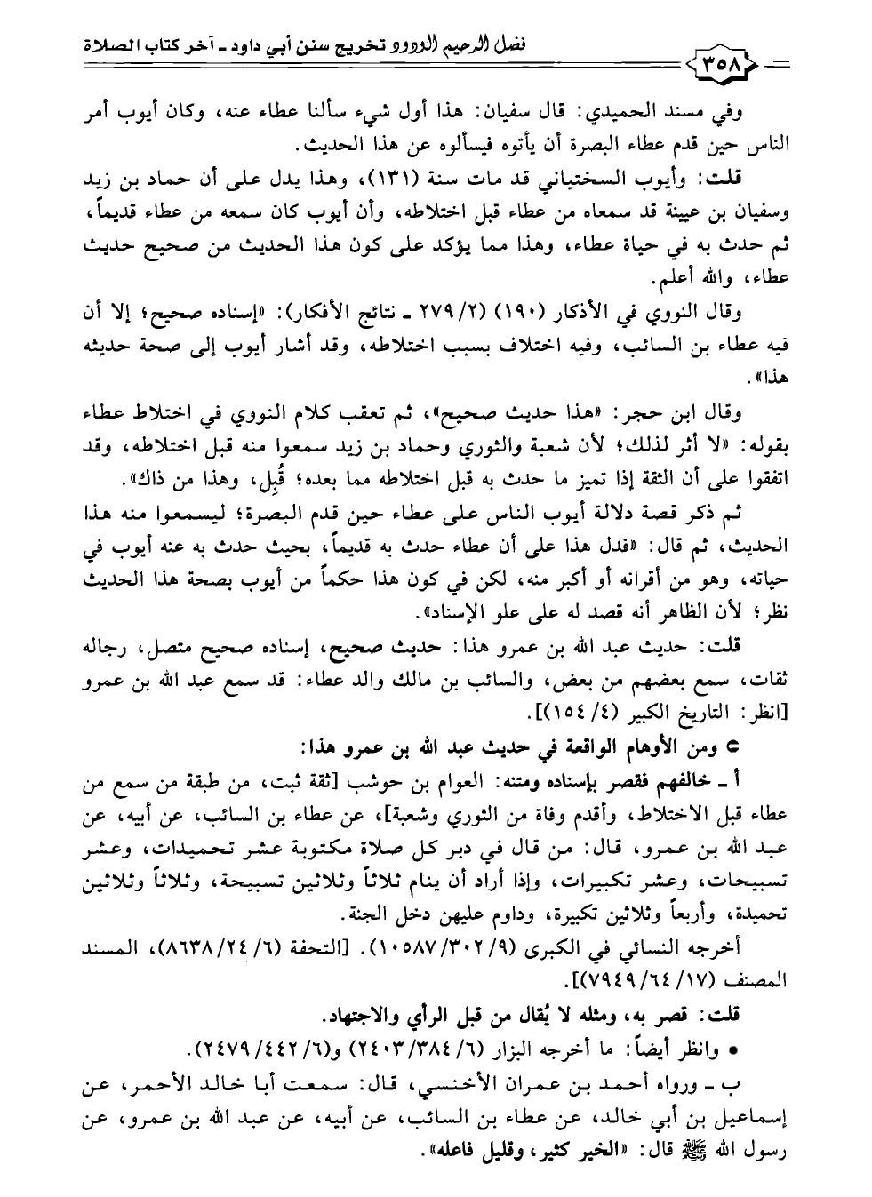 ب - ورواه أحمد بن عمران الأخنسي، قال: سمعت أبا خالد الأحمر، عن إسماعيل بن أبي خالد، عن عطاء بن السائب، عن أبيه، عن عبد الله بن عمرو، عن رسول الله - صلى الله عليه وسلم - قال: "الخير كثير، وقليل فاعله".