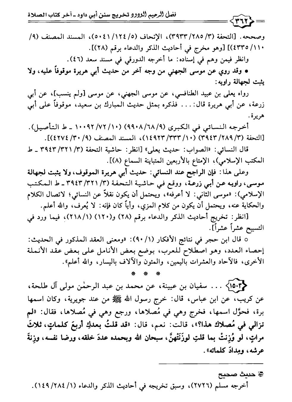 وعلى هذا: فإن الراجح عند النسائي: حديث أبي هريرة الموقوف، ولا يثبت لجهالة موسى، راويه عن أبي زرعة، ووقع في حاشية التحفة (٣/ ٣٢١/ ٣٩٤٣ - ط المكتب الإسلامي): "موسى الثاني: لا أعرفه"، ويحتمل أن يكون نقلًا عن النسائي؛ لاتصال الكلام والحكاية عنه، ويحتمل أن يكون من كلام المزي، وأيًا كان فإنه: لا يُعرف، والله أعلم.