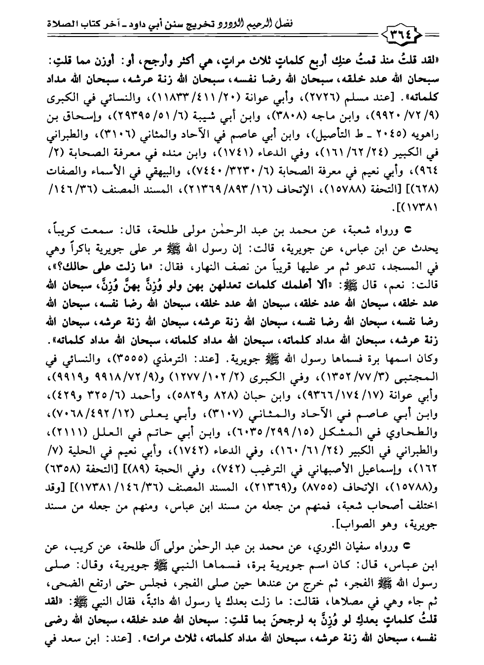 * ورواه سفيان الثوري، عن محمد بن عبد الرحمن مولى آل طلحة، عن كريب، عن ابن عباس، قال: كان اسم جويرية برة، فسماها النبي - صلى الله عليه وسلم - جويرية، وقال: صلى رسول الله - صلى الله عليه وسلم - الفجر، ثم خرج من عندها حين صلى الفجر، فجلس حتى ارتفع الضحى، ثم جاء وهي في مصلاها، فقالت: ما زلت بعدك يا رسول الله دائبةً، فقال النبي - صلى الله عليه وسلم -: "لقد قلتُ كلماتٍ يعدكِ لو وُزِنَّ به لرجحنَ بما قلتِ: سبحان الله عدد خلقه، سبحان الله رضى نفسه، سبحان الله زنة عرشه، سبحان الله مداد كلماته، ثلاث مرات". [عند: ابن سعد في