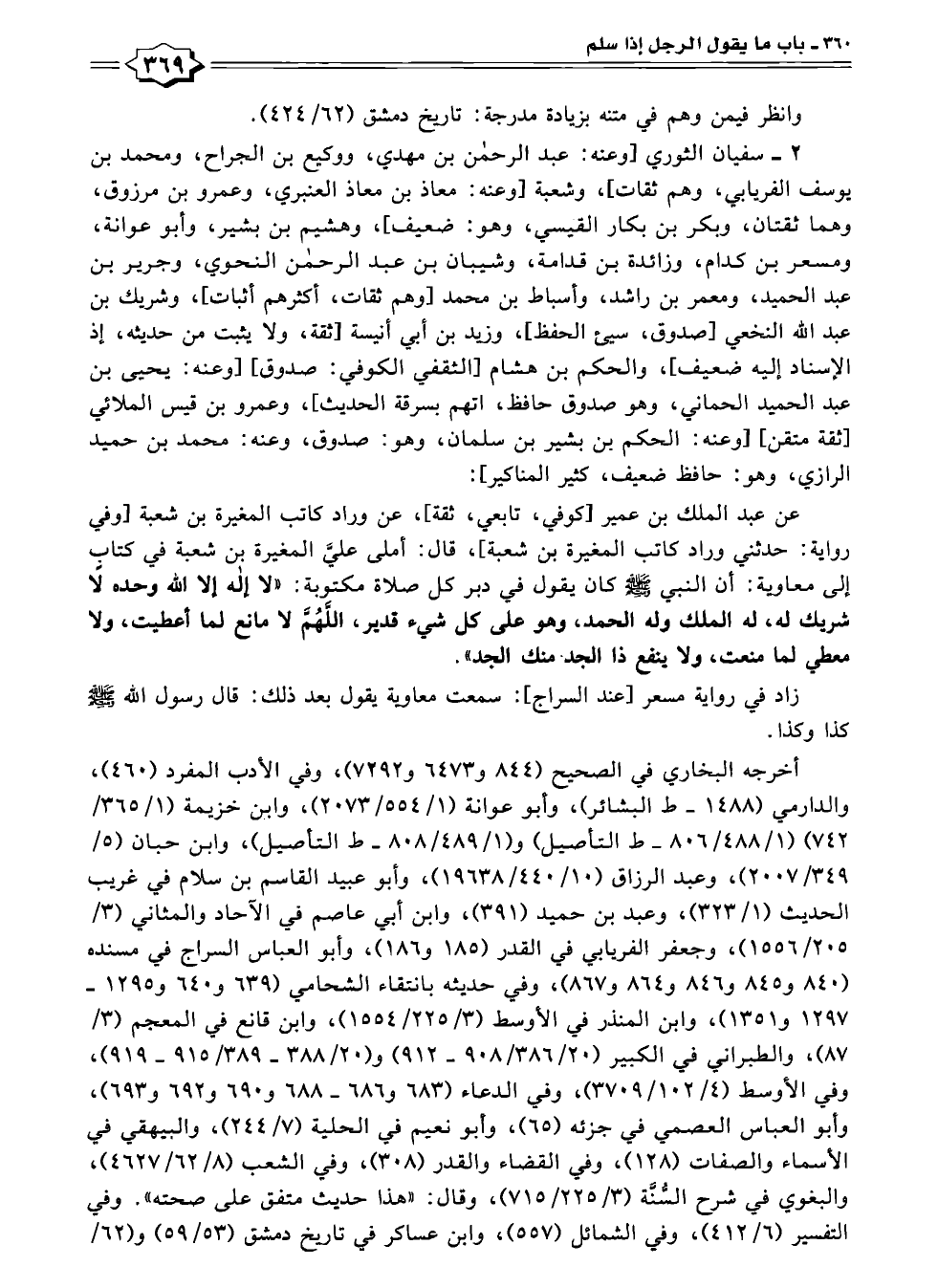 عن عبد الملك بن عمير [كوفي، تابعي، ثقة]، عن وراد كاتب المغيرة بن شعبة [وفي رواية: حدثني وراد كاتب المغيرة بن شعبة]، قال: أملى عليَّ المغيرة بن شعبة في كتابٍ إلى معاوية: أن النبي - صلى الله عليه وسلم - كان يقول في دبر كل صلاة مكتوبة: "لا إله إلا الله وحده لا شريك له، له الملك وله الحمد، وهو على كل شيء قدير، اللَّهُمَّ لا مانع لما أعطيت، ولا معطي لما منعت، ولا ينفع ذا الجد منك الجد".