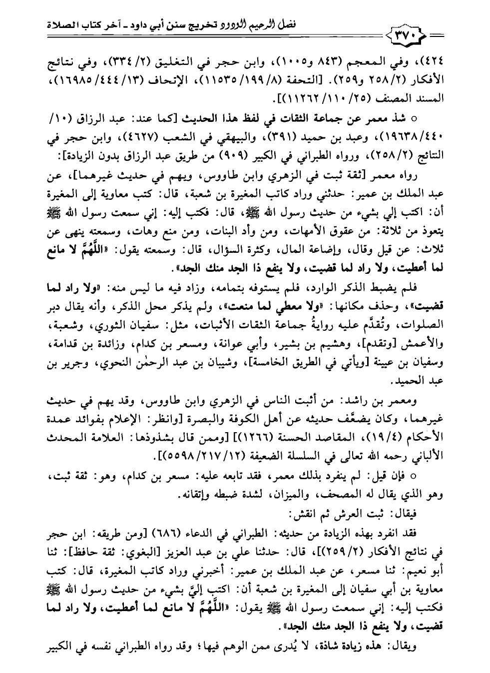فقد انفرد بهذه الزيادة من حديثه: الطبراني في الدعاء (٦٨٦) [ومن طريقه: ابن حجر في نتائج الأفكار (٢/ ٢٥٩)]، قال: حدثنا علي بن عبد العزيز [البغوي: ثقة حافظ]: ثنا أبو نعيم: ثنا مسعر، عن عبد الملك بن عمير: أخبرني وراد كاتب المغيرة، قال: كتب معاوية بن أبي سفيان إلى المغيرة بن شعبة أن: اكتب إليَّ بشيء من حديث رسول الله - صلى الله عليه وسلم - فكتب إليه: إني سمعت رسول الله - صلى الله عليه وسلم - يقول: "اللَّهُمَّ لا مانع لما أعطيت، ولا راد لما قضيت، ولا ينفع ذا الجد منك الجد".