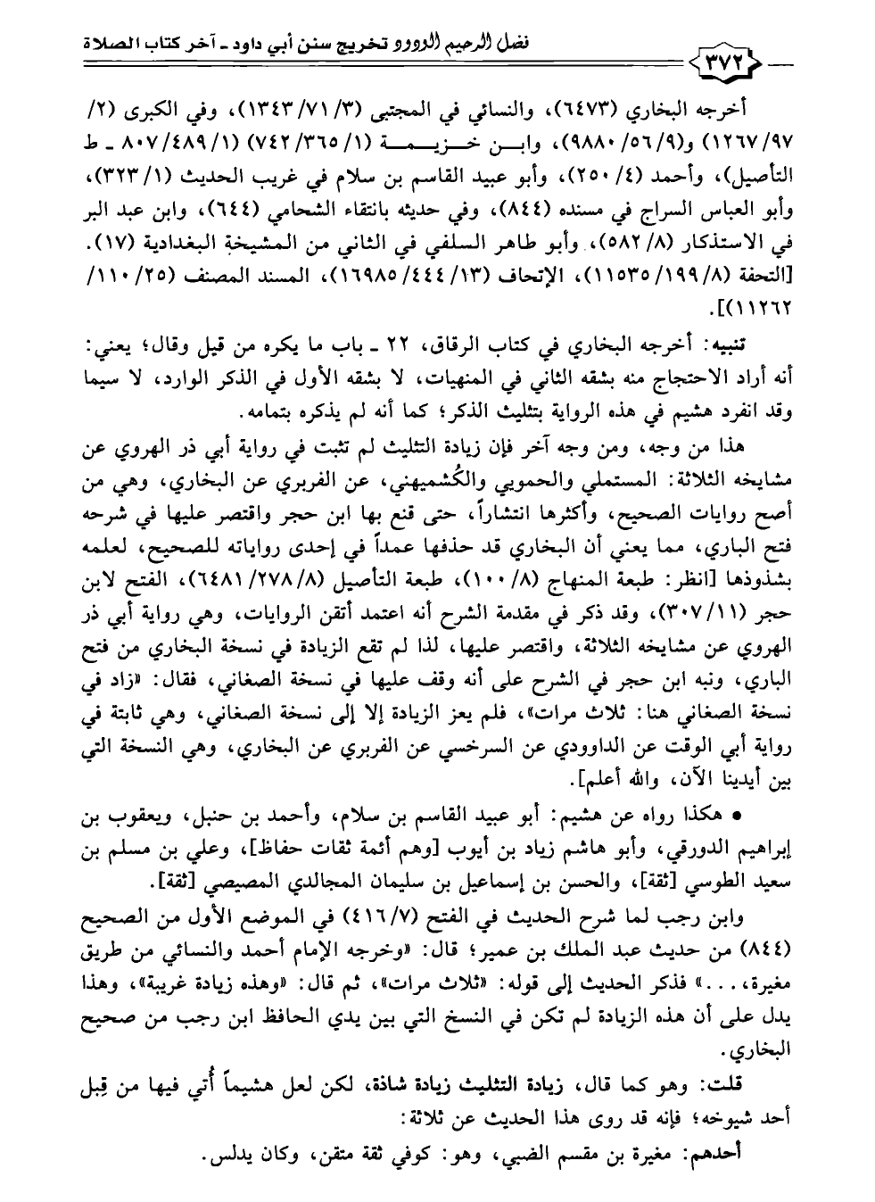 هذا من وجه، ومن وجه آخر فإن زيادة التثليث لم تثبت في رواية أبي ذر الهروي عن مشايخه الثلاثة: المستملي والحموي والكُشميهني، عن الفربري عن البخاري، وهي من أصح روايات الصحيح، وأكثرها انتشارًا، حتى قنع بها ابن حجر واقتصر عليها في شرحه فتح الباري، مما يعني أن البخاري قد حذفها عمدًا في إحدى رواياته للصحيح، لعلمه بشذوذها [انظر: طبعة المنهاج (٨/ ١٠٠)، طبعة التأصيل (٨/ ٢٧٨/ ٦٤٨١)، الفتح لابن حجر (١١/ ٣٠٧)، وقد ذكر في مقدمة الشرح أنه اعتمد أتقن الروايات، وهي رواية أبي ذر الهروي عن مشايخه الثلاثة، واقتصر عليها، لذا لم تقع الزيادة في نسخة البخاري من فتح الباري، ونبه ابن حجر في الشرح على أنه وقف عليها في نسخة الصغاني، فقال: "زاد في نسخة الصغاني هنا: ثلاث مرات"، فلم يعز الزيادة إلا إلى نسخة الصغاني، وهي ثابتة في رواية أبي الوقت عن الداوودي عن السرخسي عن الفربري عن البخاري، وهي النسخة التي ببن أيدينا الآن، والله أعلم].