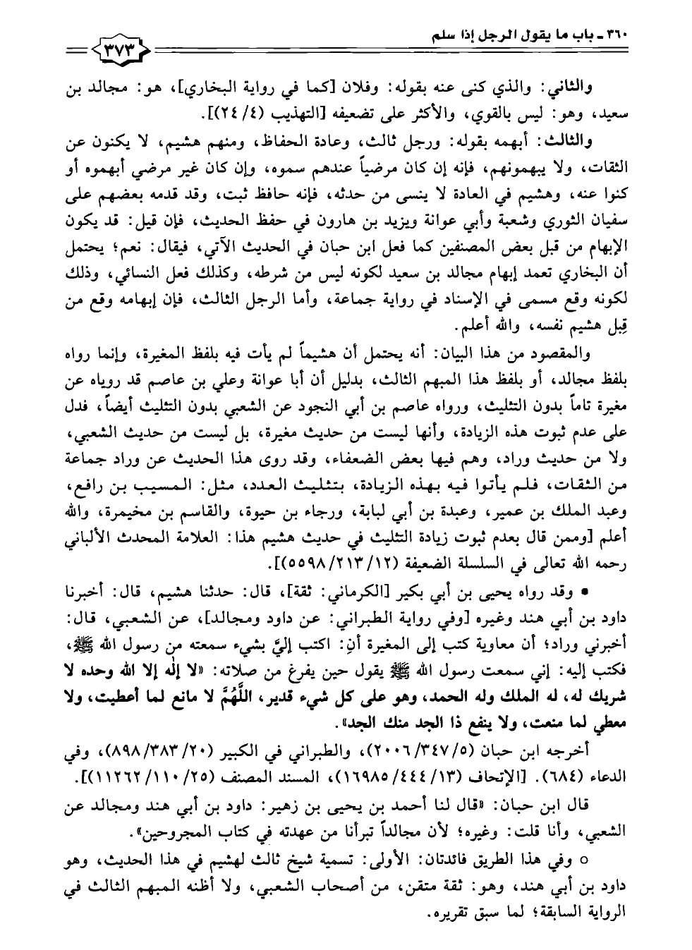 والمقصود من هذا البيان: أنه يحتمل أن هشيمًا لم يأت فيه بلفظ المغيرة، وإنما رواه بلفظ مجالد، أو بلفظ هذا المبهم الثالث، بدليل أن أبا عوانة وعلي بن عاصم قد روياه عن مغيرة تامًا بدون التثليث، ورواه عاصم بن أبي النجود عن الشعبي بدون التثليث أيضًا، فدل على عدم ثبوت هذه الزيادة، وأنها ليست من حديث مغيرة، بل ليست من حديث الشعبي، ولا من حديث وراد، وهم فيها بعض الضعفاء، وقد روى هذا الحديث عن وراد جماعة من الثقات؛ فلم يأتوا فيه بهذه الزيادة، بتثليث العدد، مثل: المسيب بن رافع، وعبد الملك بن عمير، وعبدة بن أبي لبابة، ورجاء بن حيوة، والقاسم بن مخيمرة، والله أعلم [وممن قال بعدم ثبوت زيادة التثليث في حديث هشيم هذا: العلامة المحدث الألباني رحمه الله تعالى في السلسلة الضعيفة (١٢/ ٢١٣/ ٥٥٩٨)].