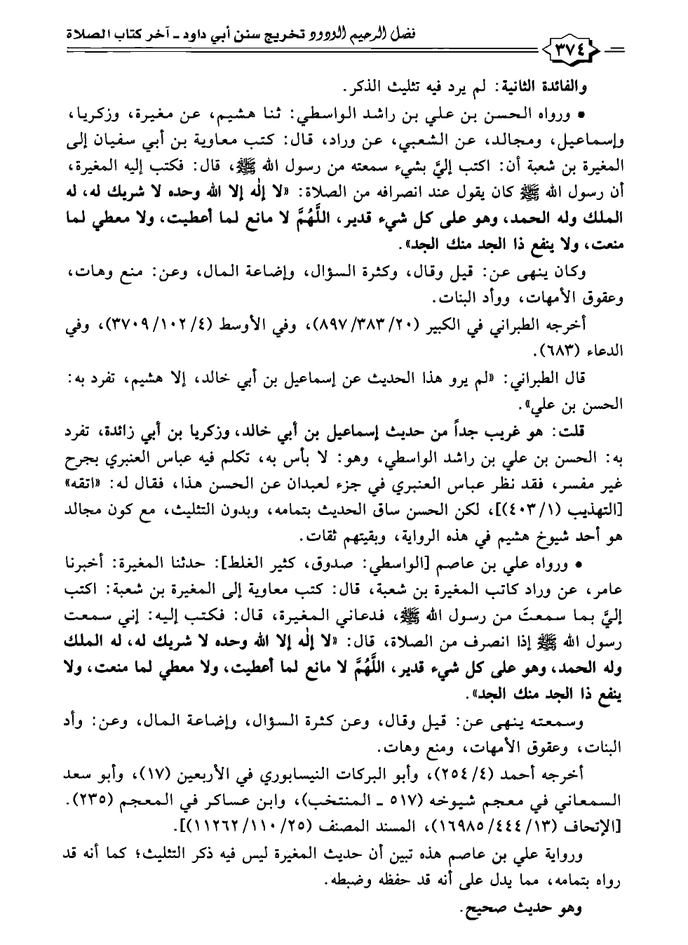 • ورواه علي بن عاصم [الواسطي: صدوق، كثير الغلط]: حدثنا المغيرة: أخبرنا عامر، عن وراد كاتب المغيرة بن شعبة، قال: كتب معاوية إلى المغيرة بن شعبة: اكتب إليَّ بما سمعتَ من رسول الله - صلى الله عليه وسلم -، فدعاني المغيرة، قال: فكتب إليه: إني سمعت رسول الله - صلى الله عليه وسلم - إذا انصرف من الصلاة، قال: "لا إله إلا الله وحده لا شريك له، له الملك وله الحمد، وهو على كل شيء قدير، اللَّهُمَّ لا مانع لما أعطيت، ولا معطي لما منعت، ولا ينفع ذا الجد منك الجد".
