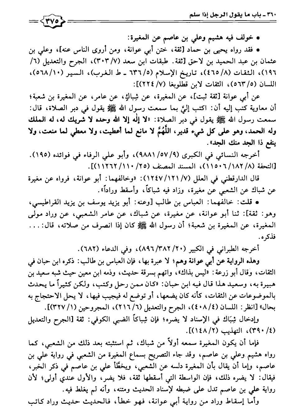 عن أبي عوانة [ثقة ثبت]، عن المغيرة، عن شِباكٍ، عن عامر، عن المغيرة بن شعبة؛ أن معاوية كتب إليه أن: اكتب إليَّ بما سمعت رسول الله - صلى الله عليه وسلم - يقول في دبر الصلاة، قال: سمعت رسول الله - صلى الله عليه وسلم - يقول في دبر الصلاة: "لا إله إلا الله وحده لا شريك له، له الملك وله الحمد، وهو على كل شيء قدير، اللُّهُمَّ لا مانع لما أعطيت، ولا معطي لما منعت، ولا ينفع ذا الجد منك الجد".