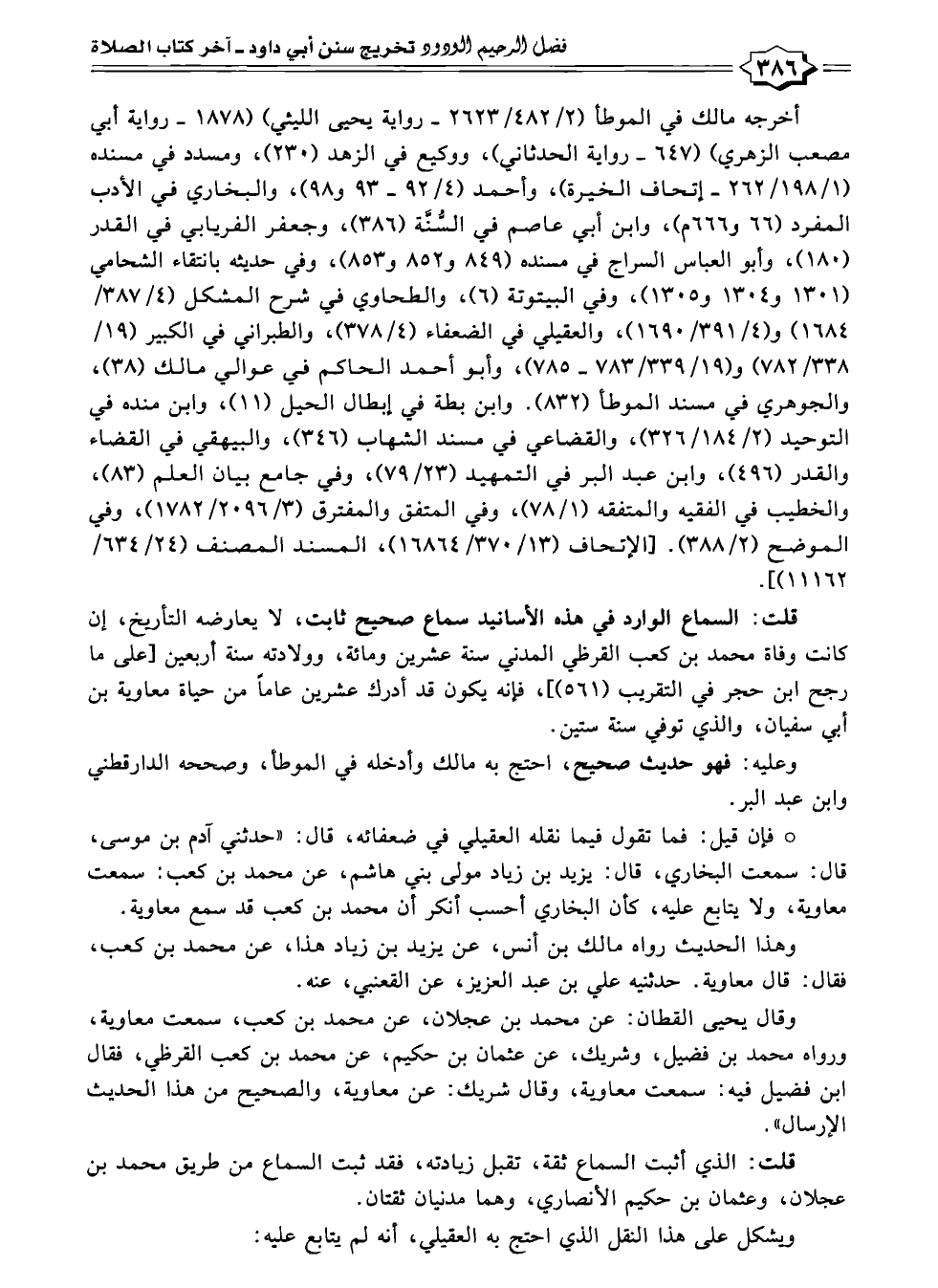 قلت: السماع الوارد في هذه الأسانيد سماع صحيح ثابت، لا يعارضه التأريخ، إن كانت وفاة محمد بن كعب القرظي المدني سنة عشرين ومائة، وولادته سنة أربعين [على ما رجح ابن حجر في التقريب (٥٦١)]، فإنه يكون قد أدرك عشرين عامًا من حياة معاوية بن أبي سفيان، والذي توفي سنة ستين.