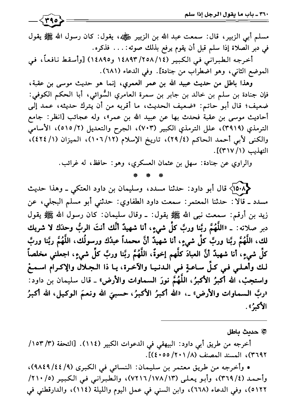 ١٥٠٨ - قال أبو داود: حدثنا مسدد، وسليمان بن داود العتكي - وهذا حديث مسدد - قالا: حدثنا المعتمر: سمعت داود الطفاوي: حدثني أبو مسلم البجلي، عن زيد بن أرقم: سمعت نبى الله - صلى الله عليه وسلم - يقول:- وقال سليمان: كان رسول الله - صلى الله عليه وسلم - يقول دبر صلاته:- "اللَّهُمَّ ربَّنا وربَّ كلِّ شيءٍ، أنا شهيدٌ أنَّك أنتَ الربُّ وحدَك لا شريك لك، اللَّهُمَّ ربَّنا وربَّ كلِّ شيءٍ، أنا شهيدٌ أنَّ محمدًا عبدُك ورسولُك، اللَّهُمَّ ربَّنا وربَّ كل شيءٍ، أنا شهيدٌّ أنَّ العبادَ كلَّهم إخوةٌ، اللَّهُمَّ ربَّنا وربَّ كلِّ شيءٍ، اجعلني مخلصًا لك وأهلي في كلِّ ساعةٍ في الدنيا والآخرة، يا ذا الجلال والإكرام اسمعْ واستجبْ، الله أكبرُ الأكبرُ، اللَّهُمَّ نورَ السماوات والأرض" - قال سليمان بن داود: "ربَّ السماوات والأرض" -، "الله أكبرُ الأكبرُ، حسبيَ الله ونعمَ الوكيل، الله أكبرُ الأكبرُ".