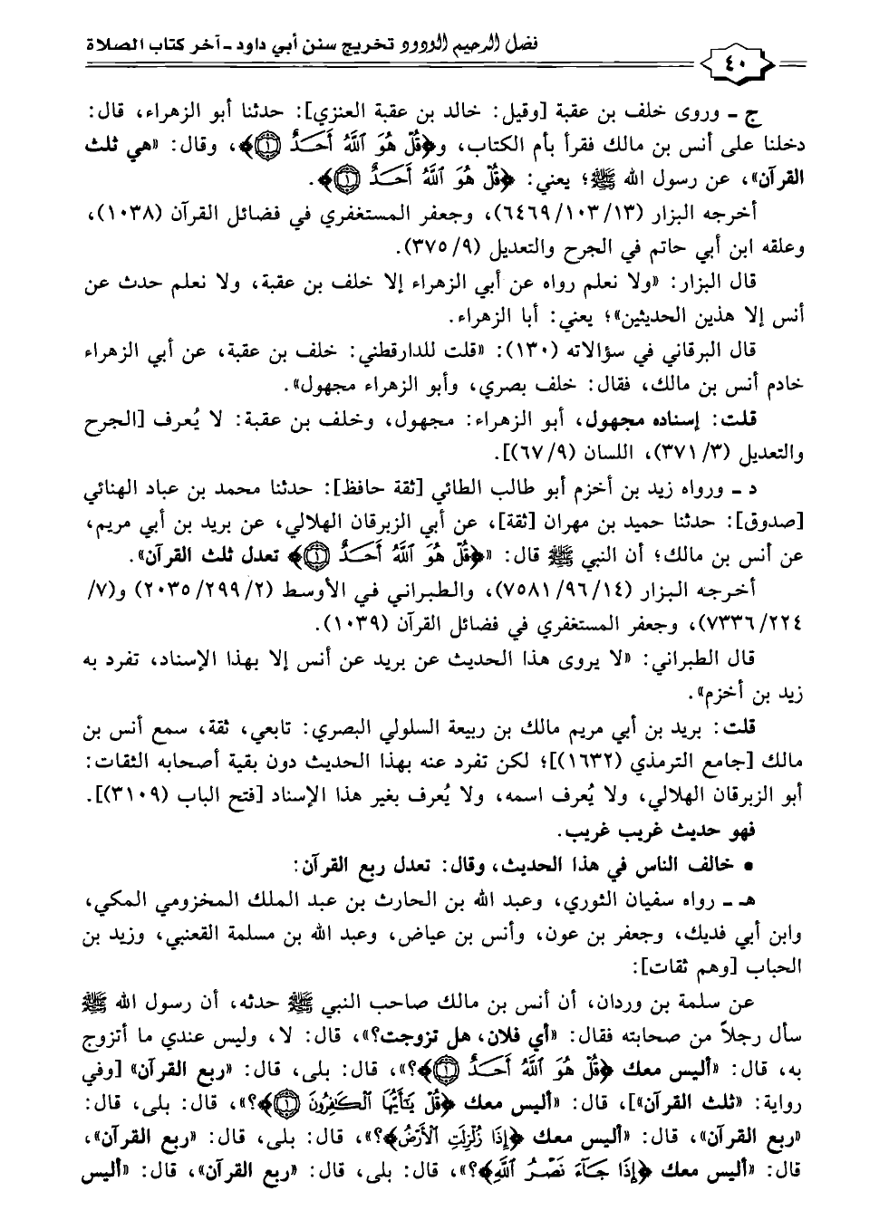 ج - وروى خلف بن عقبة [وقيل: خالد بن عقبة العنزي]: حدثنا أبو الزهراء، قال: دخلنا على أنس بن مالك فقرأ بأم الكتاب، و {قُلْ هُوَ اللَّهُ أَحَدٌ (١)}، وقال: "هي ثلث القرآن"، عن رسول الله - صلى الله عليه وسلم -؛ يعني: {قُلْ هُوَ اللَّهُ أَحَدٌ (١)}.