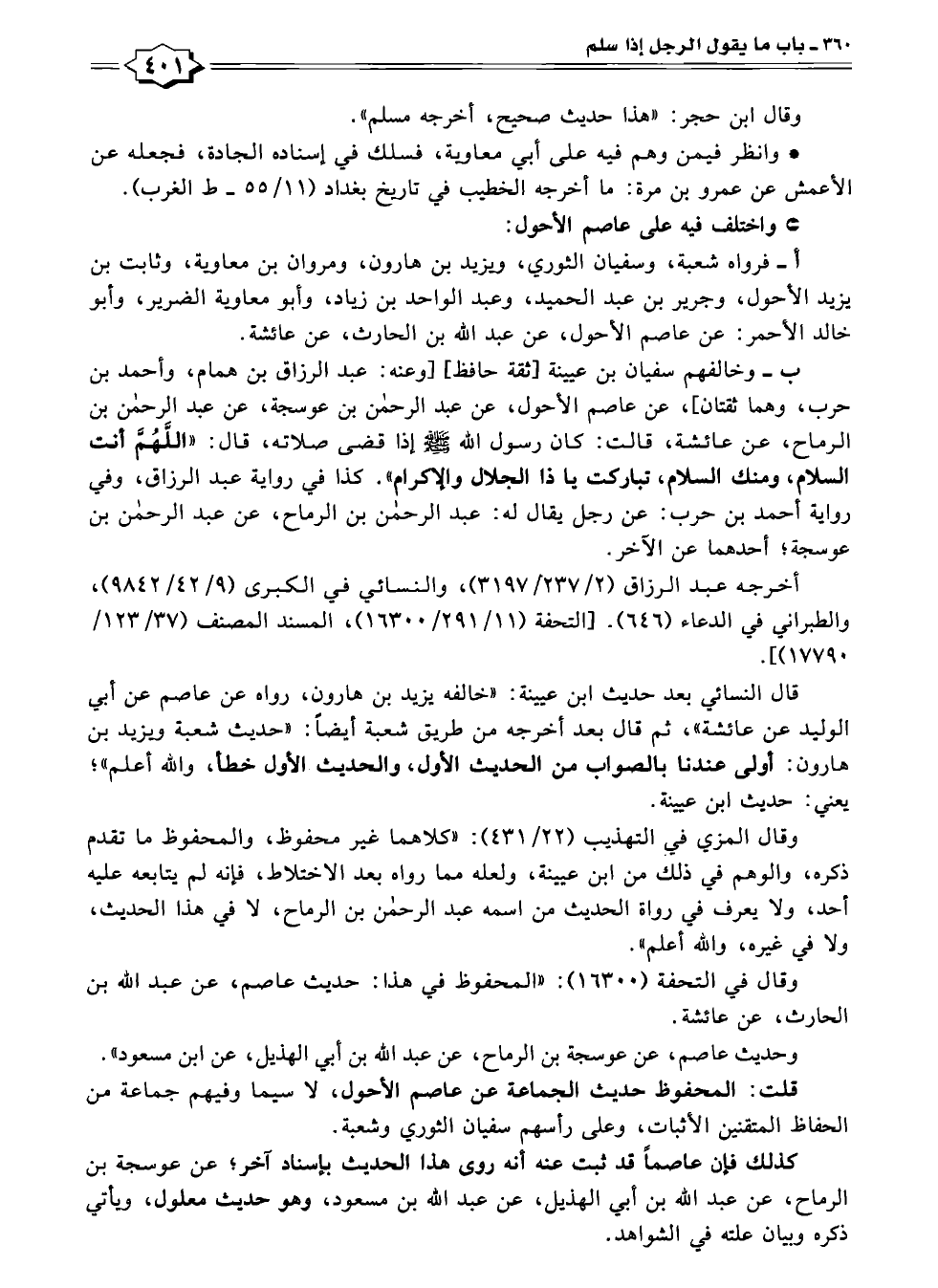 ب - وخالفهم سفيان بن عيينة [ثقة حافظ] [وعنه: عبد الرزاق بن همام، وأحمد بن حرب، وهما ثقتان]، عن عاصم الأحول، عن عبد الرحمن بن عوسجة، عن عبد الرحمن بن الرماح، عن عائشة، قالت: كان رسول ال - صلى الله عليه وسلم - إذا قضى صلاته، قال: "اللَّهُمَّ أنت السلام، ومنك السلام، تباركت يا ذا الجلال والإكرام". كذا في رواية عبد الرزاق، وفي رواية أحمد بن حرب: عن رجل يقال له: عبد الرحمن بن الرماح، عن عبد الرحمن بن عوسجة؛ أحدهما عن الآخر.