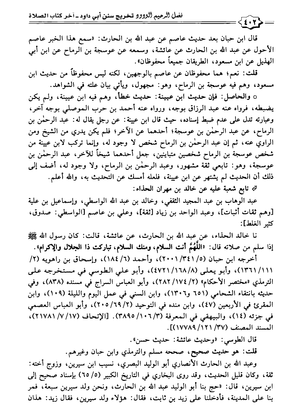 نا خالد الحذاء، عن عبد الله بن الحارث، عن عائشة، قالت: كان رسول الله - صلى الله عليه وسلم - إذا سلم من صلاته قال: "اللَّهُمَّ أنت السلام، ومنك السلام، تباركت ذا الجلال والإكرام".