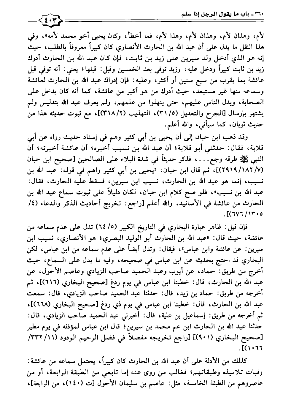 فإن قيل: ظاهر عبارة البخاري في التاريخ الكبير (٥/ ٦٤) تدل على عدم سماعه من عائشة، حيث قال: "عبد الله بن الحارث أبو الوليد البصري؛ هو الأنصاري، نسيب ابن سيرين: عن عائشة وابن عباس"، فيقال: وتدل أيضًا على عدم سماعه من ابن عباس، لكن البخاري قد احتج بحديثه عن ابن عباس في صحيحه، وفيه ما يدل على السماع، حيث أخرج من طريق: حماد، عن أيوب وعبد الحميد صاحب الزيادي وعاصم الأحول، عن عبد الله بن الحارث، قال: خطبنا ابن عباس في يوم ردغ [صحيح البخاري (٦١٦)]، ثم أخرجه من طريق: حماد بن زيد، قال: حدثنا عبد الحميد صاحب الزيادي، قال: سمعت عبد الله بن الحارث، قال: خطبنا ابن عباس في يوم ذي ردغ [صحيح البخاري (٦٦٨)]، ثم أخرجه من طريق: إسماعيل بن عليه، قال: أخبرني عبد الحميد صاحب الزيادي، قال: حدثنا عبد الله بن الحارث ابن عم محمد بن سيرين؛ قال ابن عباس لمؤذنه في يوم مطير صحيح البخاري (٩٠١)] [راجع تخريجه مفصلًا في فضل الرحيم الودود (١١/ ٣٣٢/ ١٠٦٦)].