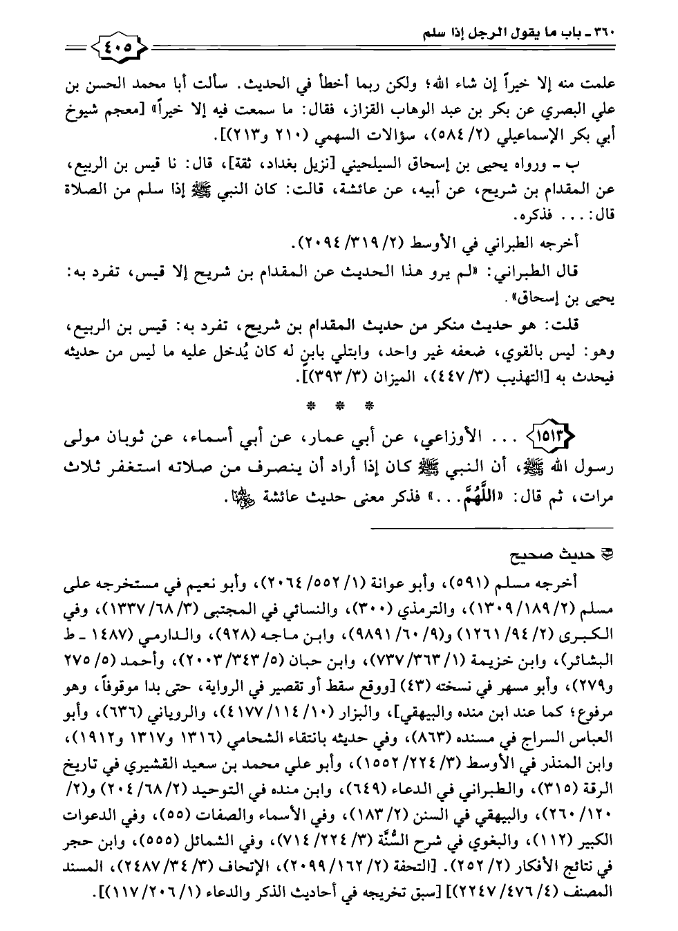ب - ورواه يحيى بن إسحاق السيلحيني [نزيل بغداد، ثقة]، قال: نا قيس بن الربيع، عن المقدام بن شريح، عن أبيه، عن عائشة، قالت: كان النبي - صلى الله عليه وسلم - إذا سلم من الصلاة قال: ... فذكره.