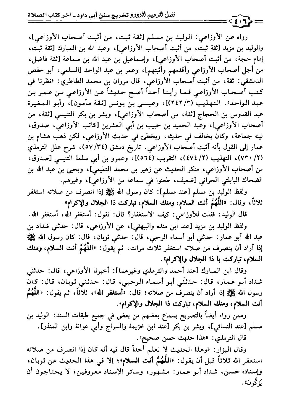 وقال البزار: "وهذا الحديث لا نعلم أحدًا قال فيه أنه كان إذا انصرف من صلاته استغفر الله ثلاثًا قبل أن يقول: "اللَّهُمَّ أنت السلام"؛ إلا في هذا الحديث عن ثوبان، وإسناده حسن، شداد أبو عمار: مشهور، وسائر الإسناد معروفين، لا يحتاجون أن يُزكَّون".