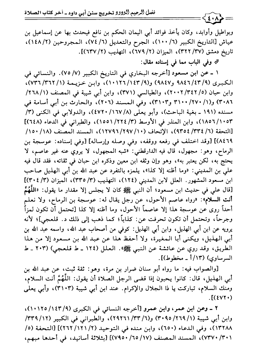 ١ - عن ابن مسعود [أخرجه البخاري في التاريخ الكبير (٧/ ٧٥). والنسائي في الكبرى (٩/ ٤٣/ ٩٨٤٦ و ٩٨٤٧) و (٩/ ١٤٣/ ١٠١٢٦)، وابن خزيمة (١/ ٣٦٢/ ٧٣٦)، وابن حبان (٥/ ٣٤٢/ ٢٠٠٢)، والطيالسي (٣٧١)، وابن أبي شيبة في المصنف (١/ ٢٦٨/ ٣٠٨٦) و (١/ ٢٧٠/ ٣١٠٠ و ٣١٠٣)، وفي المسند (٢٠٦)، والحارث بن أبي أسامة في مسنده (١٩١ - بغية الباحث)، وأبو يعلى (٨/ ١٦٧/ ٤٧٢٠)، والدولابي في الكنى (٣/ ١٠٥٣/ ١٨٥٦)، وابن المنذر في الأوسط (٣/ ٢٢٤/ ١٥٥١)، والطبراني في الدعاء (٦٤٨)] [التحفة (٦/ ٣٣٤/ ٩٣٥٤)، الإتحاف (١٠/ ٢٩٧/ ١٢٧٩٦)، المسند المصنف (١٨/ ١٥٠/ ٨٤٦٩)] [وقد اختلف في رفعه ووقفه، وفي وصله وإرساله] [وفي إسناده: عوسجة بن الرماح، وهو: مجهول، قال فيه الدارقطني: "شبه المجهول، لا يروي عنه غير عاصم، لا يحتج به، لكن يعتبر به"، وهو وإن وثقه ابن معين وذكره ابن حبان في ثقاته، فقد قال فيه علي بن المديني: "وما أظنه إلا كذا"، يلمزه بالتفرد عن عبد الله بن أبي الهذيل صاحب ابن مسعود المشهور. العلل لابن المديني (١٢٤)، التهذيب (٣/ ٣٣٥)، الميزان (٣/ ٣٠٤)] [قال علي في حديث ابن مسعود؛ أن النبي - صلى الله عليه وسلم - كان لا يجلس إلا مقدار ما يقول: "اللَّهُمَّ أنت السلام": "رواه عاصم الأحول، عن رجل يقال له: عوسجة بن الرماح، ولا نعلم أحدًا روى عن عوسجة هذا إلا عاصمًا الأحول، وما أظنه إلا كذا [تحتمل أن تكون لمزًا وجرحًا، وتحتمل أن تكون تحرفت عن: كذابًا؛ كما ذهب إلى ذلك د. قلعجي]؛ لأنه يرويه عن ابن أبي الهذيل، وابن أبي الهذيل: كوفي من أصحاب عبد الله، واسمه عبد الله بن أبي الهذيل، ويكنى أبا المغيرة، ولا أحفظ هذا عن عبد الله بن مسعود إلا من هذا الطريق، وقد روي عن عائشة عن النبي - صلى الله عليه وسلم -". العلل (١٢٤ - ط قلعجي) (٢٠٣ - ط السرساوي) (١٣/ أ - مخطوط)].