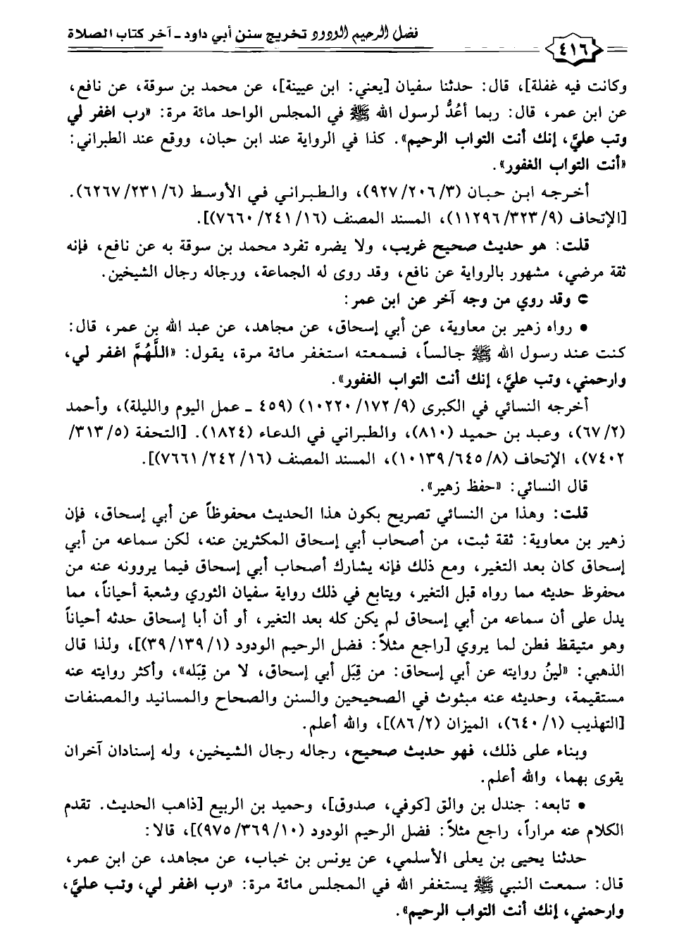 * رواه زهير بن معاوية، عن أبي إسحاق، عن مجاهد، عن عبد اللّه بن عمر، قال: كنت عند رسول اللّه - صلى الله عليه وسلم - جالسًا، فسمعته استغفر مائة مرة، يقول: "اللَّهُمَّ اغفر لي، وارحمني، وتب عليَّ، إنك أنت التواب الغفور".