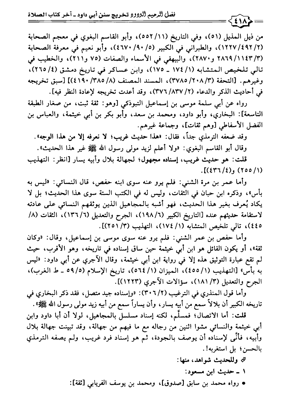 قلت: أما الاتصال؛ فمسلَّم، لكنه إسناد مسلسل بالمجاهيل، لولا أن أبا داود وابن أبي خيثمة والنسائي مشوا اثنين من رجاله مع ما فيهم من جهالة، وقد تبينت جهالة بلال وأبيه، فأنَّى لإسناده أن يوصف بالجودة، ثم هو إسناد فرد غريب، ولم يصفه الترمذي بالحسن؛ بل استغربه!.