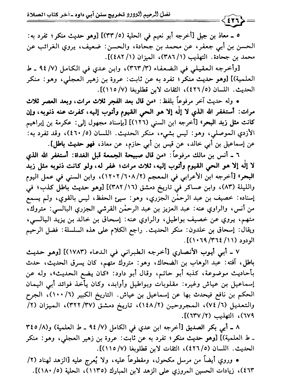 * وله حديث آخر مرفوعًا بلفظ: "من قال بعد الفجر ثلاث مرات، وبعد العصر ثلاث مرات: أستغفر الله الذي لا إله إلا هو الحي القيوم وأتوب إليه، غفرت عنه ذنوبه، وإن كانت مثل زبد البحر" [أخرجه ابن السني (١٢٦] [بإسناد مجهول إلى: عكرمة بن إبراهيم الأزدي الموصلي، وهو: ليس بشيء، منكر الحديث. اللسان (٥/ ٤٦٠)، وقد تفرد به: عن إسماعيل بن أبي خالد، عن قيس بن أبي حازم، عن معاذ، فهو حديث باطل].