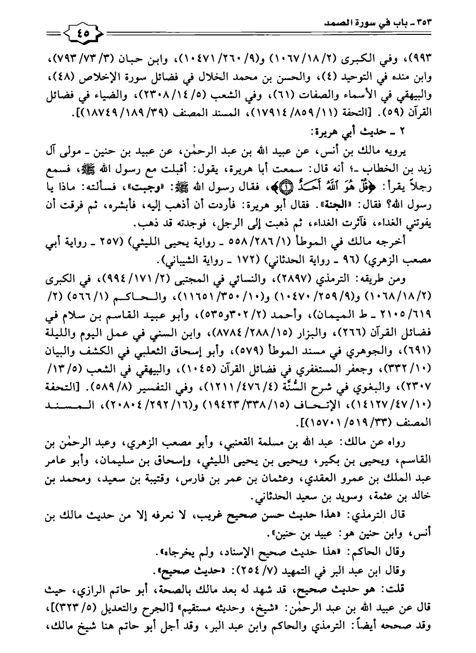 يرويه مالك بن أنس، عن عبيد الله بن عبد الرحمن، عن عبيد بن حنين - مولى آل زيد بن الخطاب -؛ أنه قال: سمعت أبا هريرة، يقول: أقبلت مع رسول الله - صلى الله عليه وسلم -، فسمع رجلاً يقرأ: {قُلْ هُوَ اللَّهُ أَحَدٌ (١)}، فقال رسول الله - صلى الله عليه وسلم -: "وجبت"، فسألته: ماذا يا رسول الله؟ فقال: "الجنة". فقال أبو هريرة: فأردت أن أذهب إليه، فأبشره، ثم فرقت أن يفوتني الغداء، فآثرت الغداء، ثم ذهبت إلى الرجل، فوجدته قد ذهب.