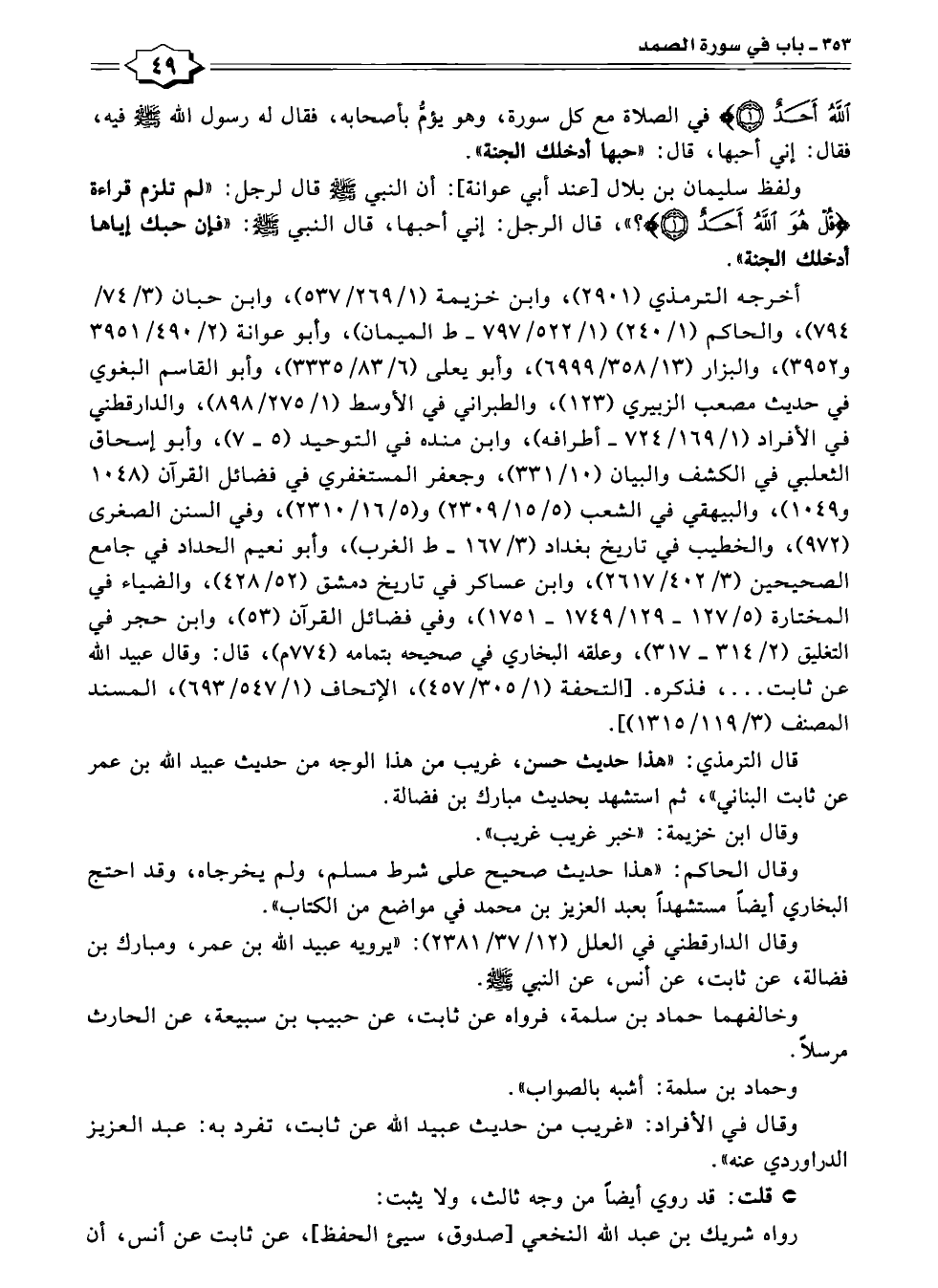 اللَّهُ أَحَدٌ (١)} في الصلاة مع كل سورة، وهو يؤمُّ بأصحابه، فقال له رسول الله - صلى الله عليه وسلم - فيه، فقال: إني أحبها، قال: "حبها أدخلك الجنة".