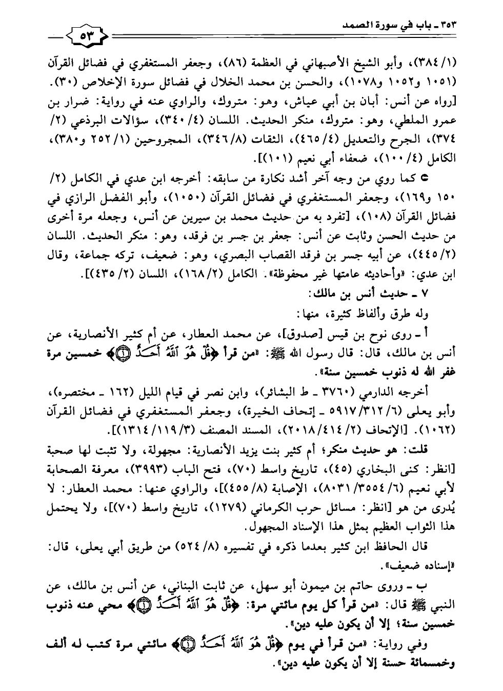 أ - روى نوح بن قيس [صدوق]، عن محمد العطار، عن أم كثير الأنصارية، عن أنس بن مالك، قال: قال رسول الله - صلى الله عليه وسلم -: "من قرأ {قُلْ هُوَ اللَّهُ أَحَدٌ (١)} خمسين مرة غفر الله له ذنوب خمسين سنة".
