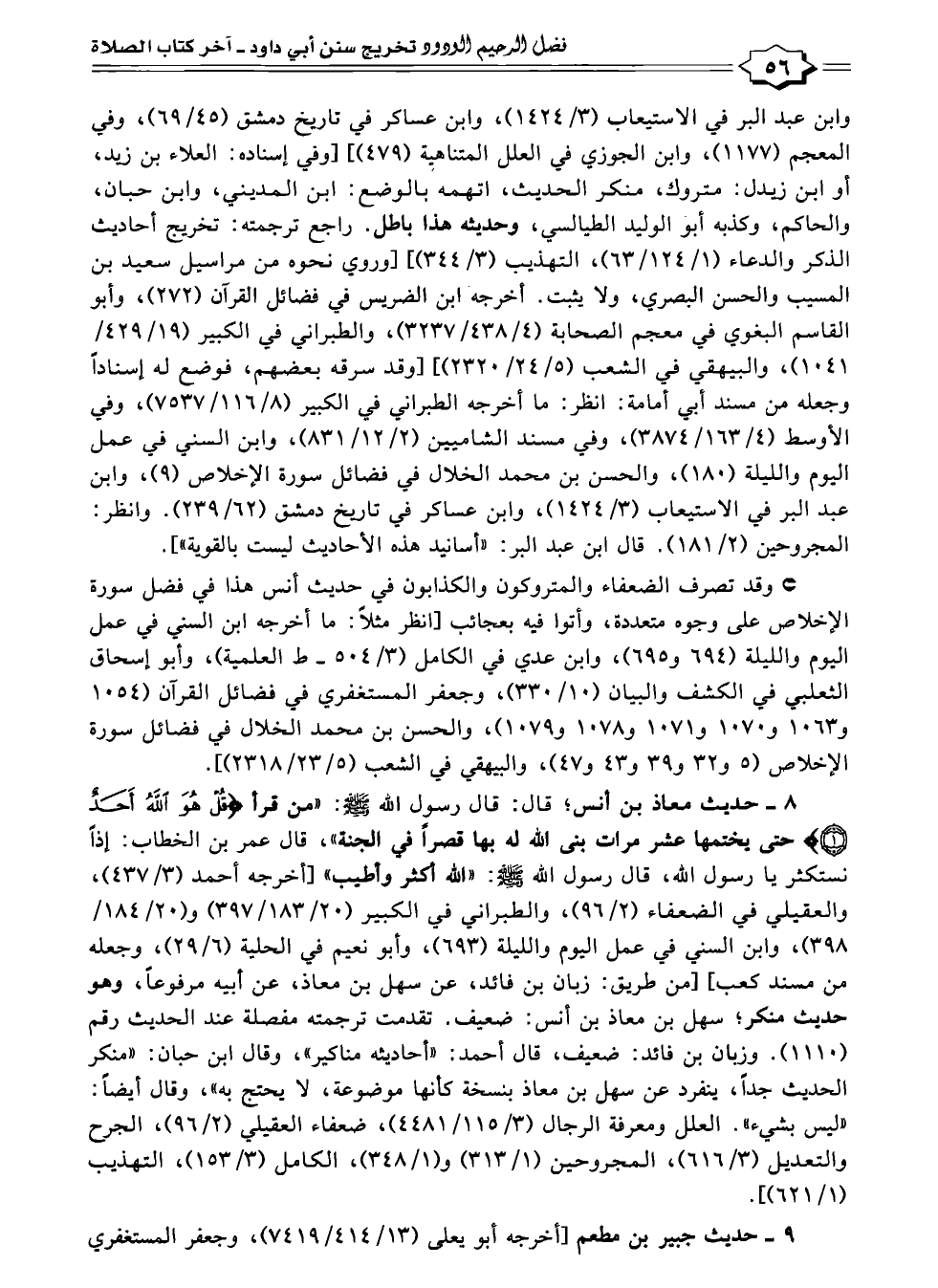 ٨ - حديث معاذ بن أنس؛ قال: قال رسول الله - صلى الله عليه وسلم -: "من قرأ {قُلْ هُوَ اللَّهُ أَحَدٌ (١)} حتى يختمها عشر مرات بنى الله له بها قصراً في الجنة"، قال عمر بن الخطاب: إذاً نستكثر يا رسول الله، قال رسول الله - صلى الله عليه وسلم -: "الله أكثر وأطيب" [أخرجه أحمد (٣/ ٤٣٧)، والعقيلي في الضعفاء (٢/ ٩٦)، والطبراني في الكبير (٢٠/ ١٨٣/ ٣٩٧) و (٢٠/ ١٨٤/ ٣٩٨)، وابن السني في عمل اليوم والليلة (٦٩٣)، وأبو نعيم في الحلية (٦/ ٢٩)، وجعله من مسند كعب] [من طريق: زبان بن فائد، عن سهل بن معاذ، عن أبيه مرفوعاً، وهو حديث منكر؛ سهل بن معاذ بن أنس: ضعيف. تقدمت ترجمته مفصلة عند الحديث رقم (١١١٠). وزبان بن فائد: ضعيف، قال أحمد: "أحاديثه مناكير"، وقال ابن حبان: "منكر الحديث جداً، ينفرد عن سهل بن معاذ بنسخة كأنها موضوعة، لا يحتج به"، وقال أيضاً: "ليس بشيء". العلل ومعرفة الرجال (٣/ ١١٥/ ٤٤٨١)، ضعفاء العقيلي (٢/ ٩٦)، الجرح والتعديل (٣/ ٦١٦)، المجروحين (١/ ٣١٣) و (١/ ٣٤٨)، الكامل (٣/ ١٥٣)، التهذيب (١/ ٦٢١)].