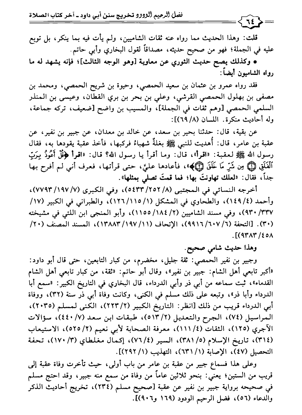 وعلى هذا فسماع جبير من عقبة بن عامر من باب أولى، حيث تأخرت وفاة عقبة إلى قريب من الستين؛ يعني: بنحو ثلاثين عامًا من وفاة من سمع منه جبير، وقد احتج مسلم في صحيحه برواية جبير بن نفير عن عقبة [صحيح مسلم (٢٣٤)، تخريج أحاديث الذكر والدعاء (٥٦)، فضل الرحيم الودود (١٦٩ و ٩٠٦)].