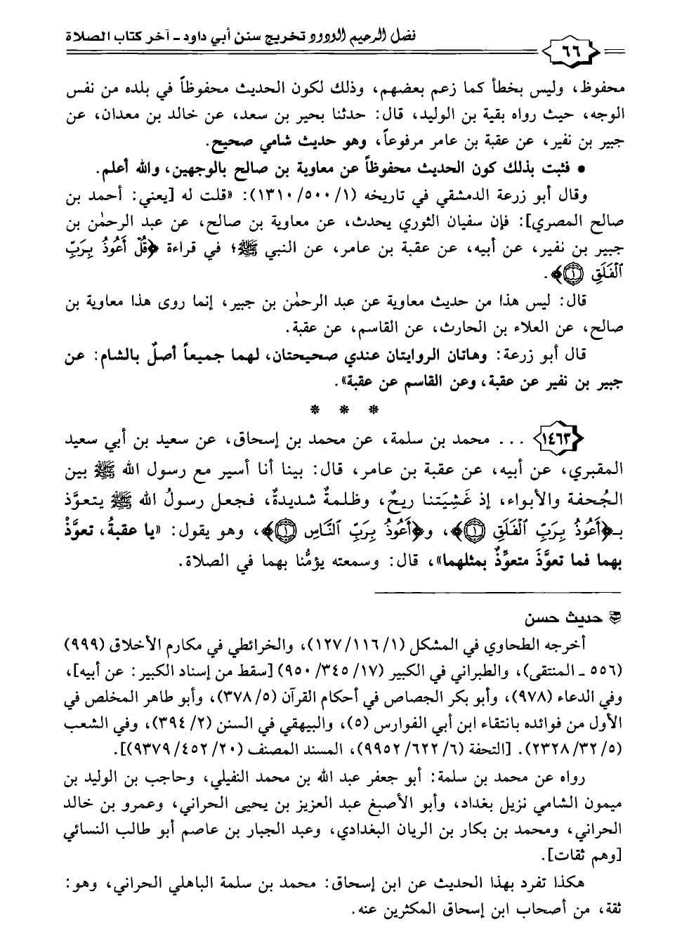 وقال أبو زرعة الدمشقي في تاريخه (١/ ٥٠٠/ ١٣١٠): "قلت له [يعني: أحمد بن صالح المصري]: فإن سفيان الثوري يحدث، عن معاوية بن صالح، عن عبد الرحمن بن جبير بن نفير، عن أبيه، عن عقبة بن عامر، عن النبي -صلى الله عليه وسلم-؛ في قراءة {قُلْ أَعُوذُ بِرَبِّ الْفَلَقِ (١)}.