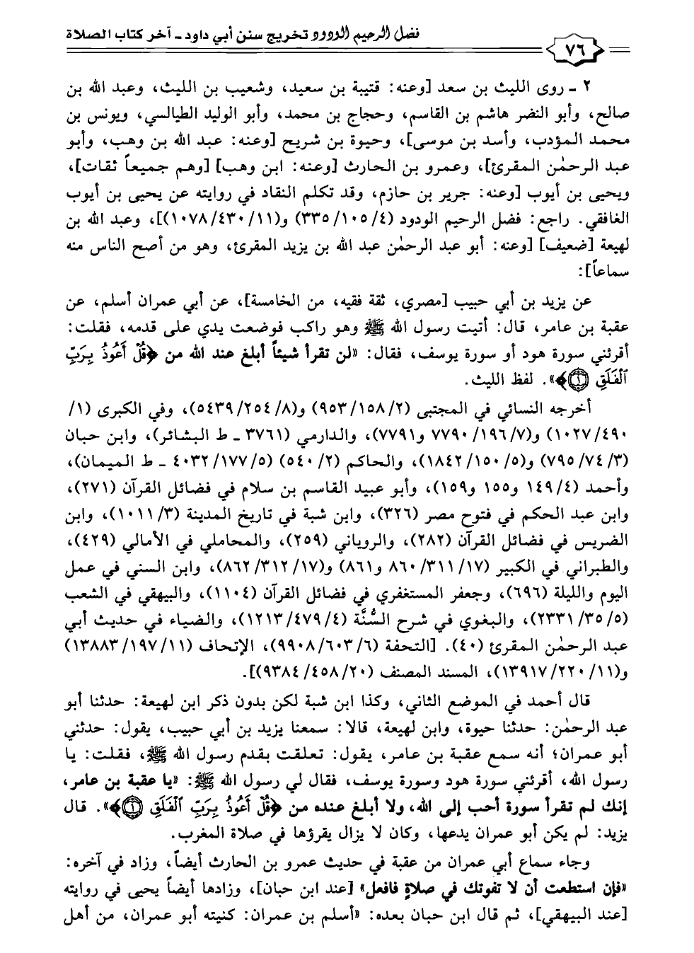عن يزيد بن أبي حبيب [مصري، ثقة فقيه، من الخامسة]، عن أبي عمران أسلم، عن عقبة بن عامر، قال: أتيت رسول الله -صلى الله عليه وسلم- وهو راكب فوضعت يدي على قدمه، فقلت: أقرئني سورة هود أو سورة يوسف، فقال: "لن تقرأ شيئًا أبلغ عند الله من {قُلْ أَعُوذُ بِرَبِّ الْفَلَقِ (١)} ". لفظ الليث.