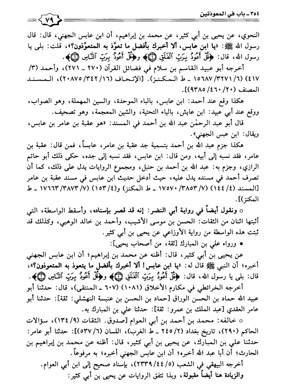 النحوي، عن يحيى بن أبي كثير، عن محمد بن إبراهيم، أن ابن عابس الجهني، قال: قال رسول الله -صلى الله عليه وسلم-: "يا ابن عابس، ألا أخبرك بأفضل ما تعوَّذ به المتعوِّذون؟ "، قلت: بلى يا رسول الله، قال: {قُلْ أَعُوذُ بِرَبِّ الْفَلَقِ (١)} و {قُلْ أَعُوذُ بِرَبِّ النَّاسِ (١)}.
