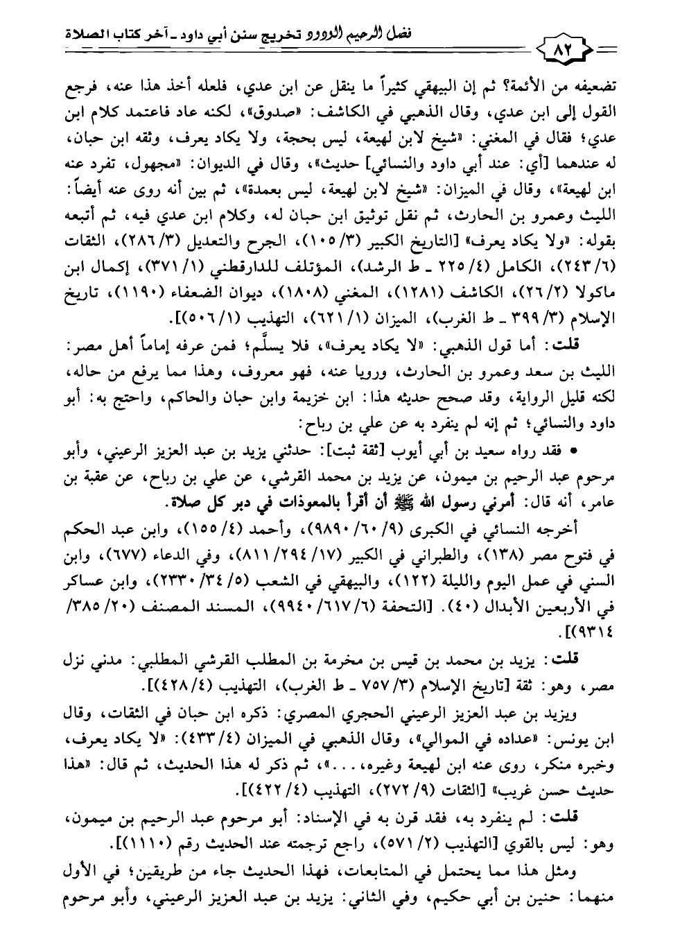 تضعيفه من الأئمة؟ ثم إن البيهقي كثيرًا ما ينقل عن ابن عدي، فلعله أخذ هذا عنه، فرجع القول إلى ابن عدي، وقال الذهبي في الكاشف: "صدوق"، لكنه عاد فاعتمد كلام ابن عدي؛ فقال في المغني: "شيخ لابن لهيعة، ليس بحجة، ولا لِكاد يعرف، وثقه ابن حبان، له عندهما [أي: عند أبي داود والنسائي] حديث"، وقال في الديوان: "مجهول، تفرد عنه ابن لهيعة"، وقال في الميزان: "شيخ لابن لهيعة، ليس بعمدة"، ثم بين أنه روى عنه أيضًا: الليث وعمرو بن الحارث، ثم نقل توثيق ابن حبان له، وكلام ابن عدي فيه، ثم أتبعه بقوله: "ولا يكاد يعرف" [التاريخ الكبير (٣/ ١٠٥)، الجرح والتعديل (٣/ ٢٨٦)، الثقات (٦/ ٢٤٣)، الكامل (٤/ ٢٢٥ - ط الرشد)، المؤتلف للدارقطني (١/ ٣٧١)، إكمال ابن ماكولا (٢/ ٢٦)، الكاشف (١٢٨١)، المغني (١٨٠٨)، ديوان الضعفاء (١١٩٠)، تاريخ الإسلام (٣/ ٣٩٩ - ط الغرب)، الميزان (١/ ٦٢١)، التهذيب (١/ ٥٠٦)].
